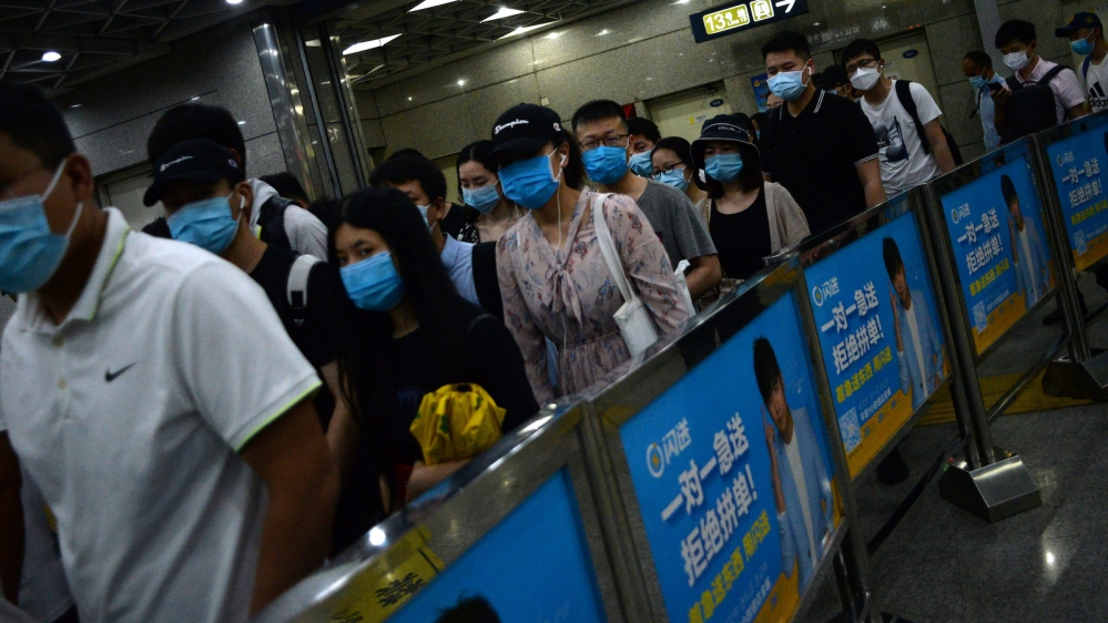 Commuters crowding to go to work in Beijing on Monday despite a spike in new coronavirus cases originating in a food market in the city, contributing to a drop in share prices across Asia [Tingshu Wang/Reuters]
