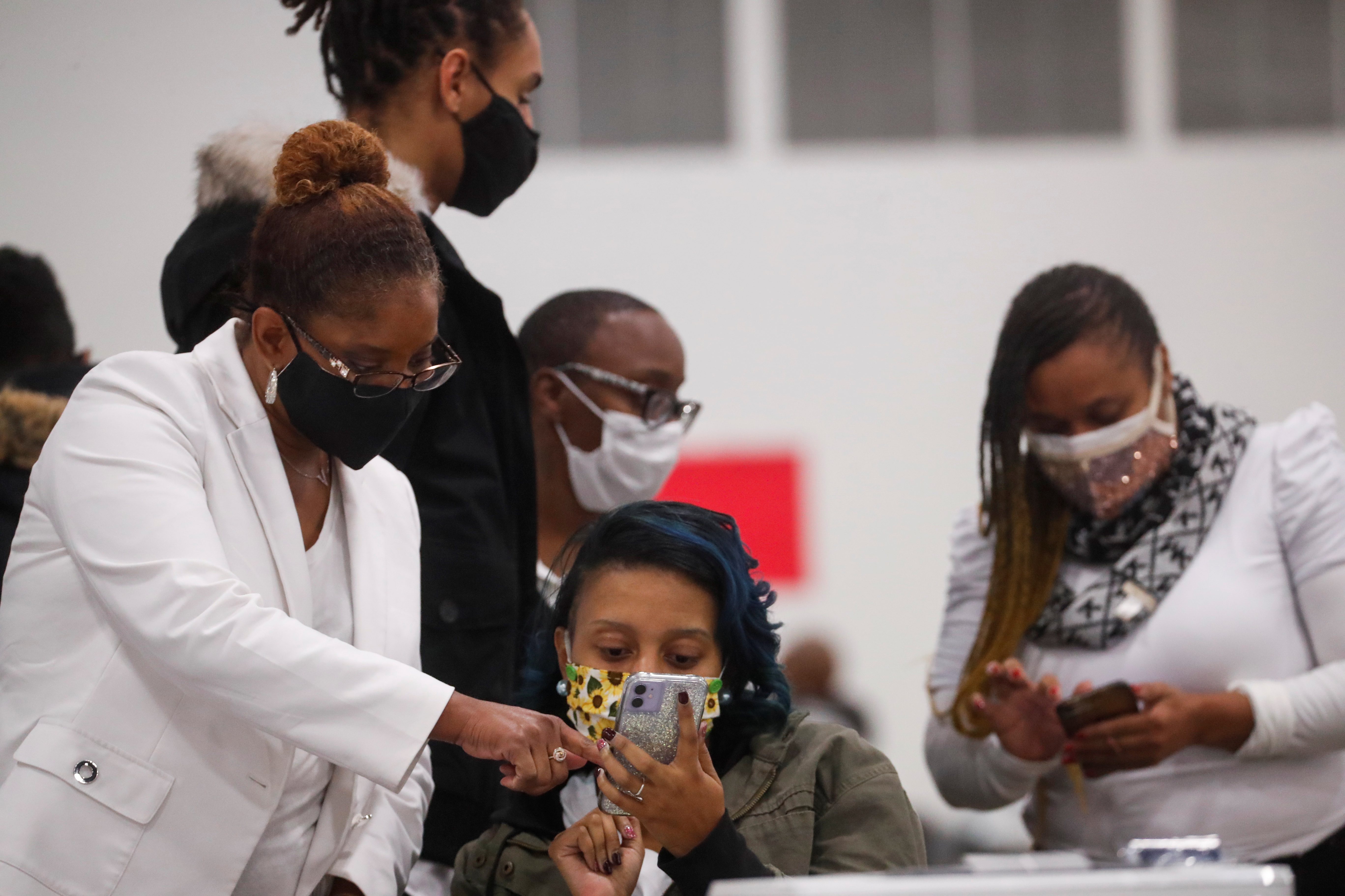 People look at mobile phones as votes continue to be counted at the TCF Center the day after the 2020 US presidential election, in Detroit, Michigan, US [File: Shannon Stapleton/Reuters]