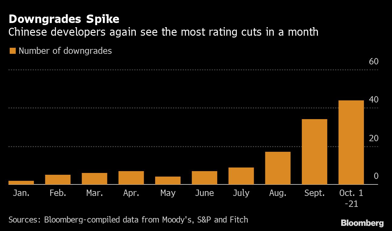 Credit-rating downgrades of Chinese developers have accelerated further in October, hitting a record high for a second straight month. There were 44 cuts in the sector by Moody’s Investors Service, S&P Global Ratings and Fitch Ratings as of Oct. 21, after 34 downgrades for all of September, according to Bloomberg-compiled data.