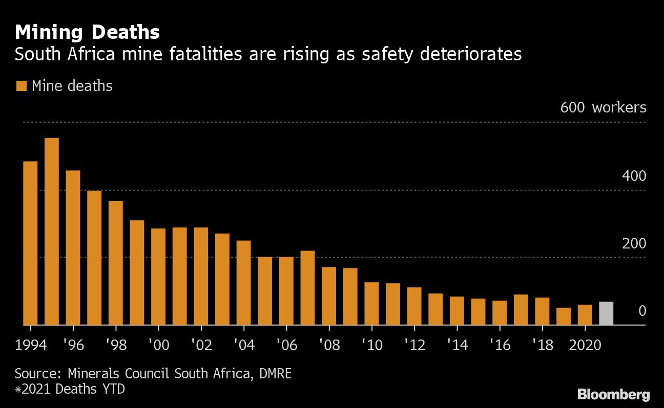 The toll so far in 2021 was 69, up from 48 a year-earlier, the Department of Mineral Resources and Energy said in a statement Monday. In 2019, 51 people died over the whole year, the lowest number of fatalities on record, before climbing to 60 last year.