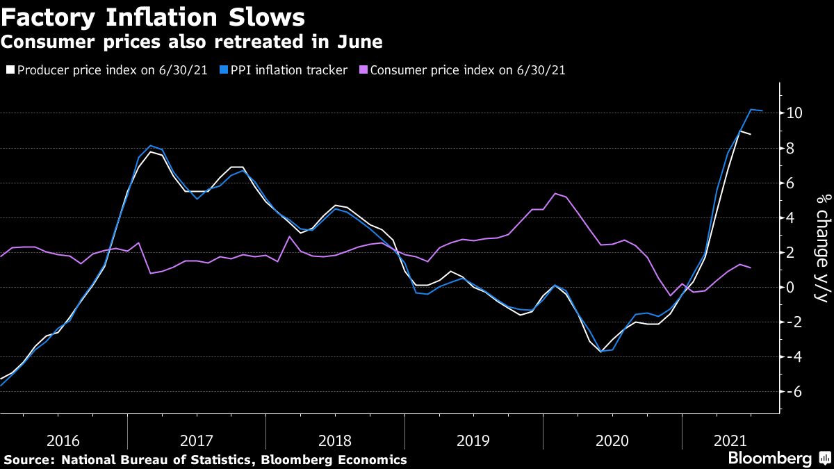 Data on Thursday is expected to show growth eased in the second quarter to 8% from the record gain of 18.3% in the first quarter, according to a Bloomberg poll of economists. Key readings of retail sales, industrial production and fixed asset investment are all set to moderate too.