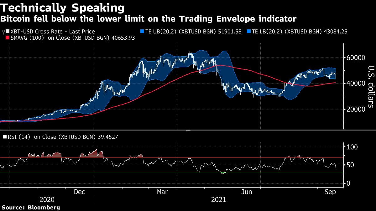 Bitcoin was down 8.1% to trade around $43,743 as of 5:11 p.m. in New York. It had dropped as much as as 10.7% earlier, which pushed it below $43,000 and to its lowest level since the beginning of August. Ether briefly dropped below $3,000. Popular DeFi tokens some of the biggest declines: Cardano fell more than 10% over the last 24 hours, as did Dogecoin, while Polkadot lost roughly 16%, according to CoinMarketCap.com.