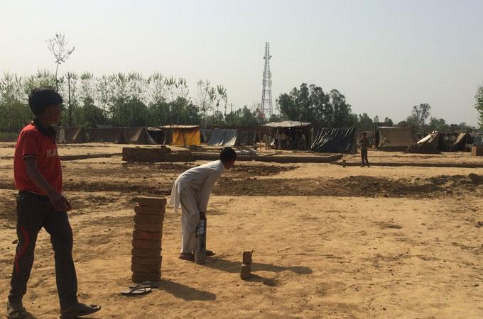 The filth of open drains starts to smell more intense under the blazing sun. The men, who could no longer beat the heat inside the tents, gather under a tree, while women find space in the corner.