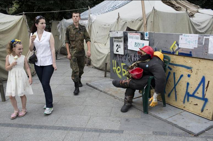 At Maidan itself, the square of fountains and white brick and marble is still mostly invisible under its coating of dilapidated army tents. Chants of “Glory to Ukraine! Glory to the heroes!” echo across small groups of camped-out drunks, curious foreign tourists, retirees, pro-Ukrainian militiamen and people living in the city centre walking their dogs or meeting up for dates. Most say that those camping out here are not those who fought against Yanukovich’s forces.