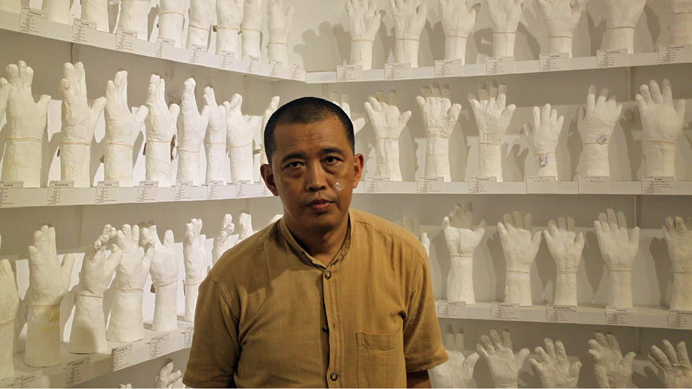 While creating a cast of one of their hands using plaster of Paris, Htein Lin talks with them about their experiences behind bars, and the process is filmed or photographed for his multimedia piece.
