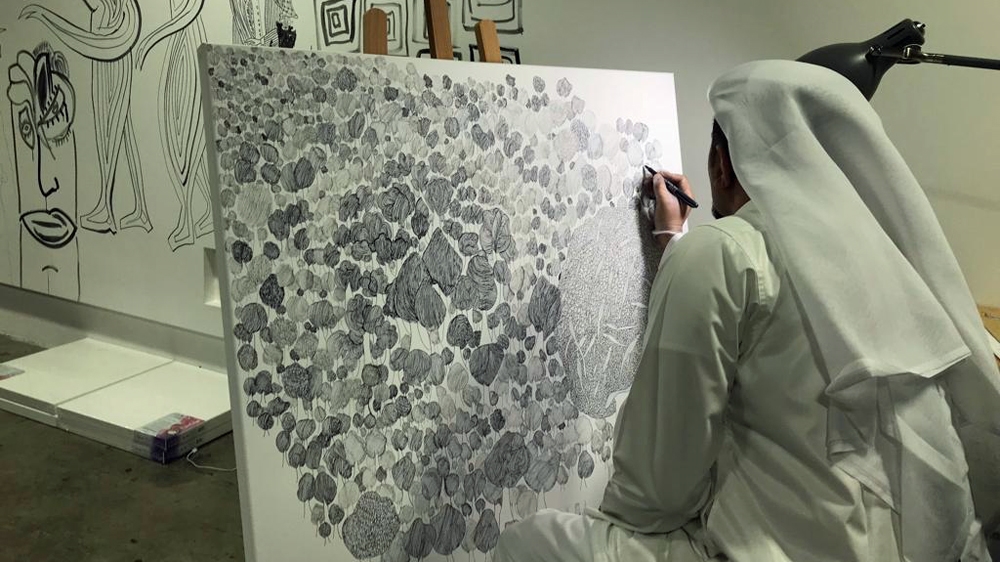 In all of his drawings, Al Mulla attempts to “raise questions” in his art and depict his thoughts through the use of discursive, achromatic lines. “With colours, an artist can say a lot of things,” said Al Mulla, who has a colour-mixed optic condition. “But the line technique is limitless, you can attract people to the ideas inside your brain through endless lines.”