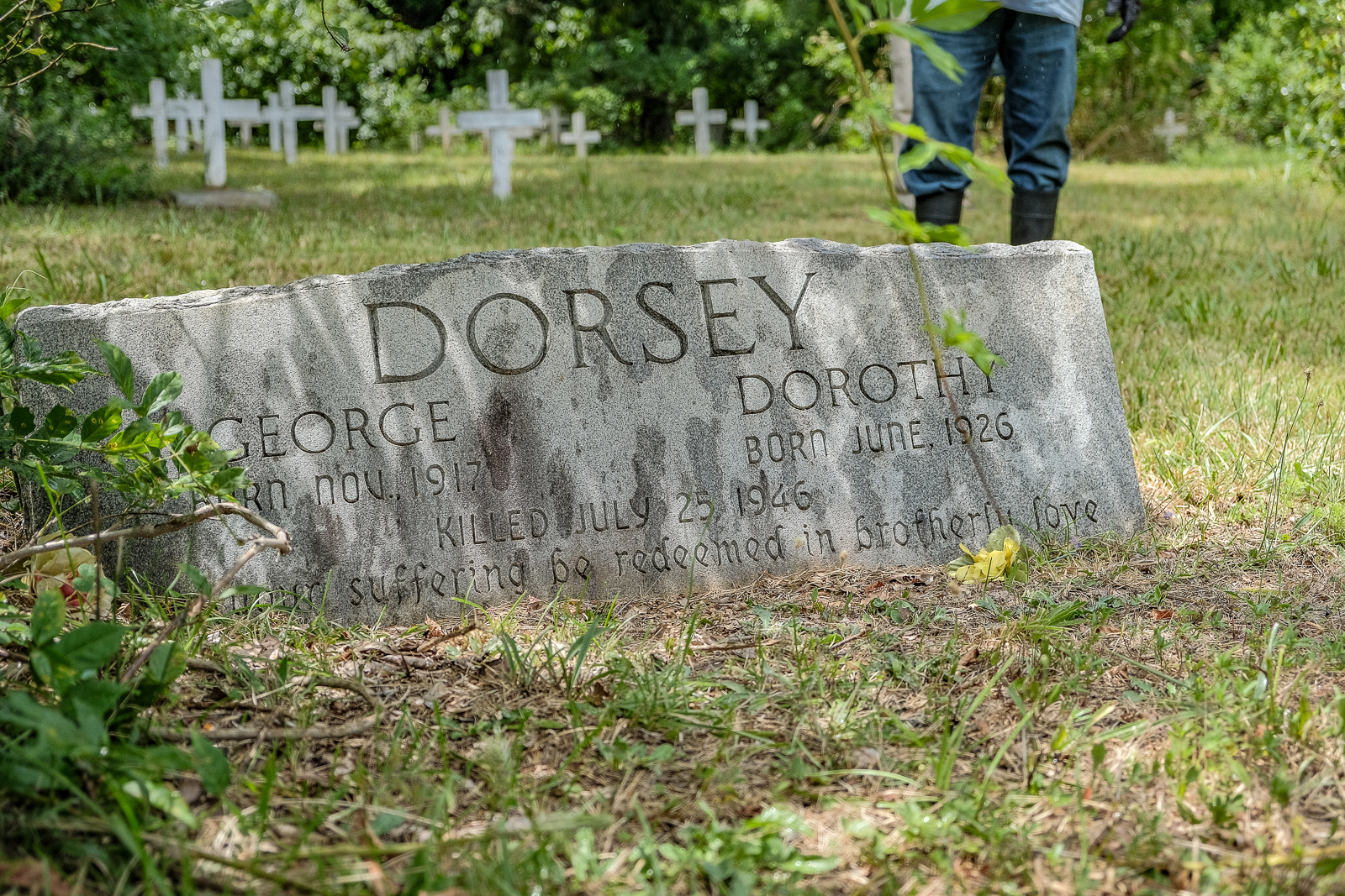 Among the wooden crosses, tombs and gravestones sits the shared headstone of siblings George Dorsey and Dorothy Malcolm.