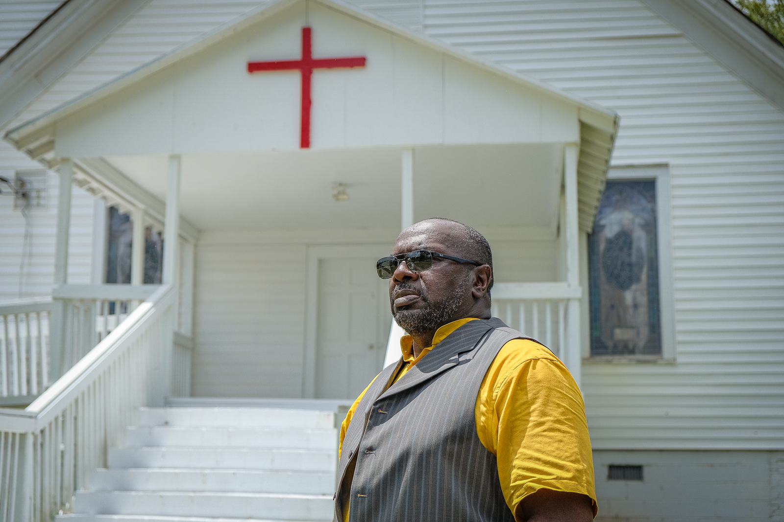 Beyond the neatly-aligned homes are miles of vibrant green fields, once used as cotton plantations, and beyond those, down a short dirt road, is a small cemetery, with an old, white church at its entrance.