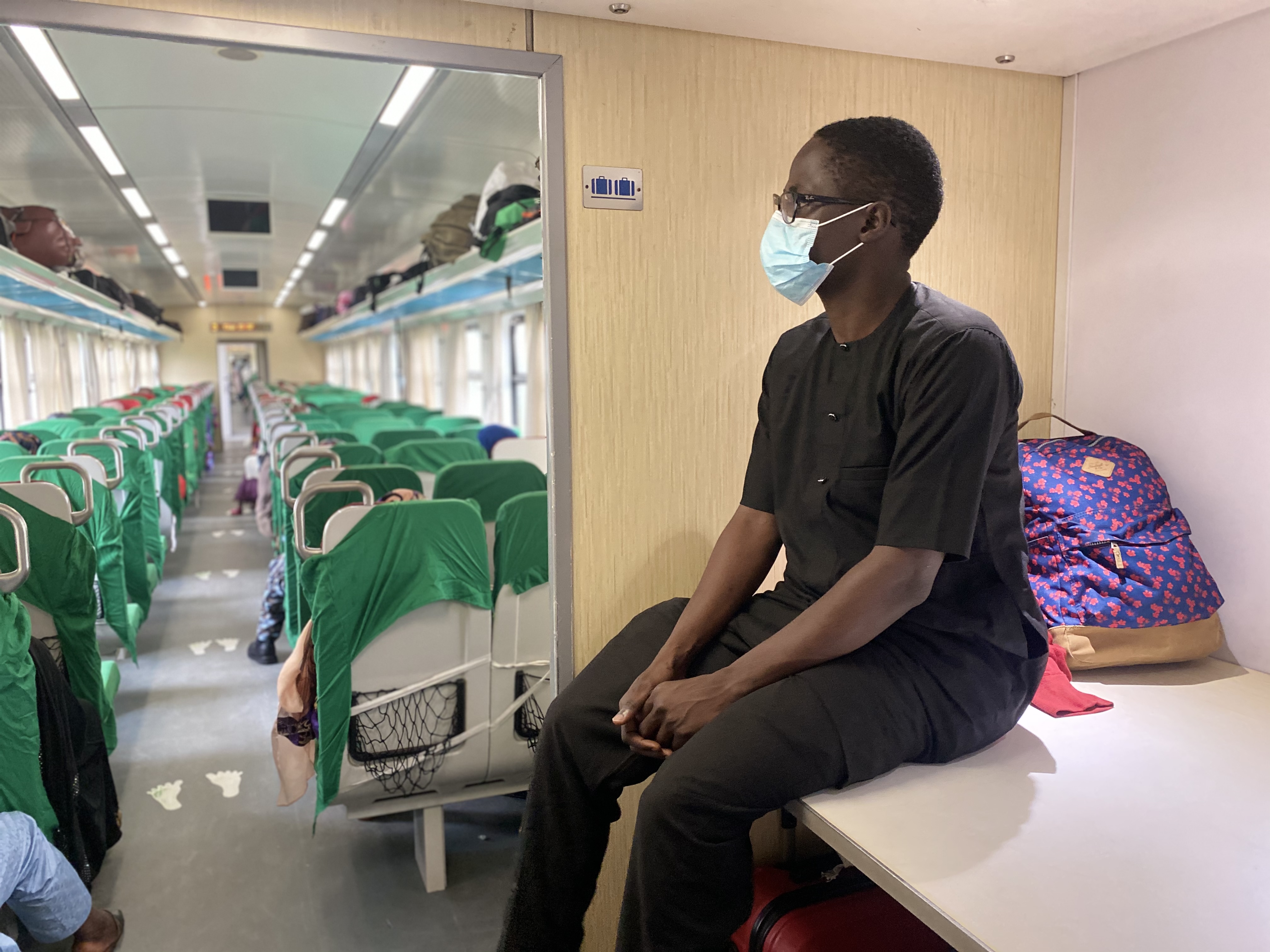 When we board the train at Jere to head back to Kaduna, we cannot find seats as all of the coaches have been filled to half capacity and the other seats must remain empty due to social distancing protocols. Alternate seats are marked off with red masking tape, and the train conductors ensure passengers do not sit in them.