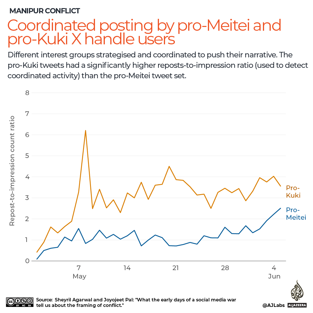 Pal and Agarwal’s research showed that initially, handles sympathising with or affiliated with the Kuki community mushroomed and tweeted actively with well-coordinated messaging.