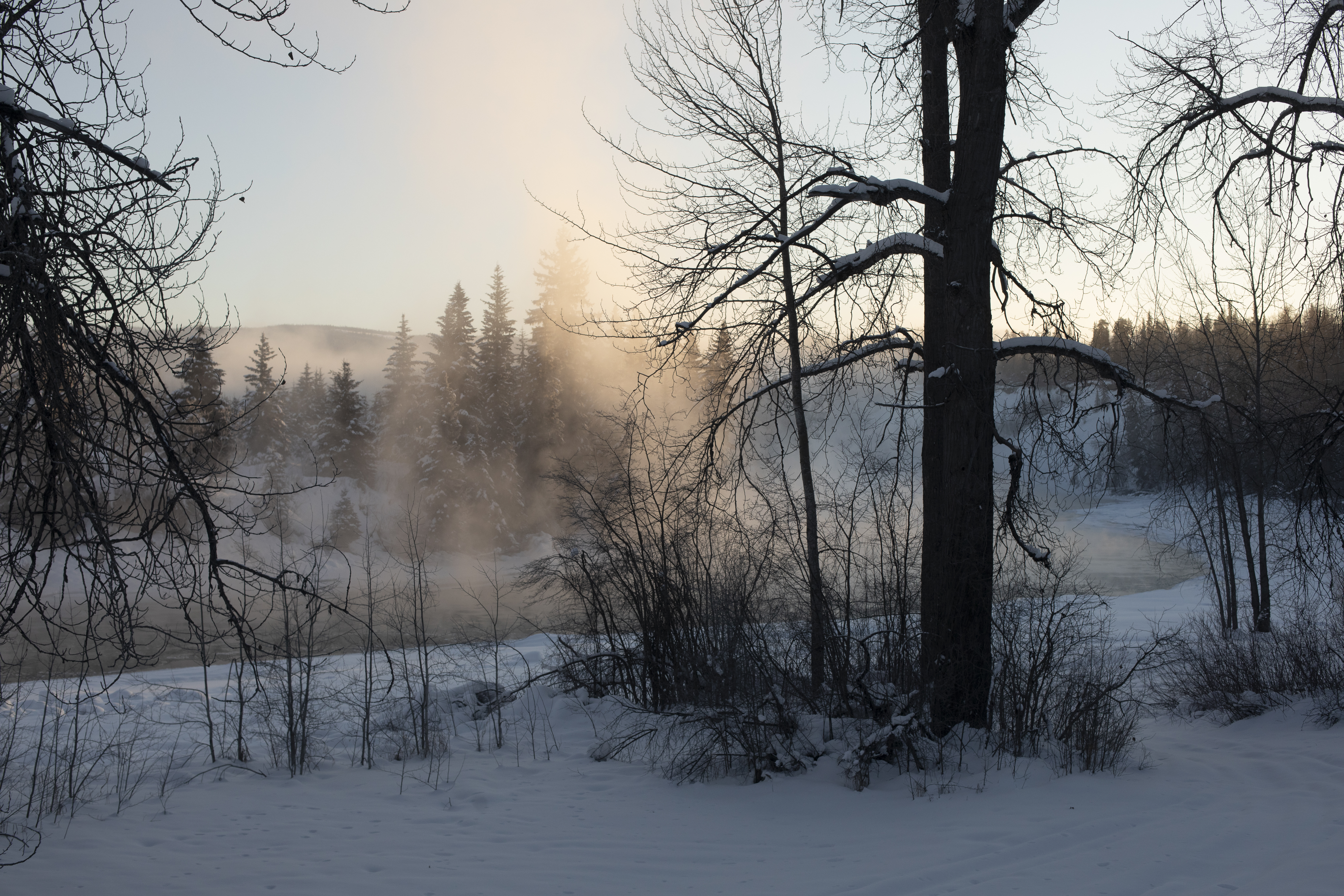 British Columbia, Canada - On a crisp February morning, on the edge of the city of Terrace, plumes of smoke rise from the chimneys of a row of tiny steel-roofed homes.