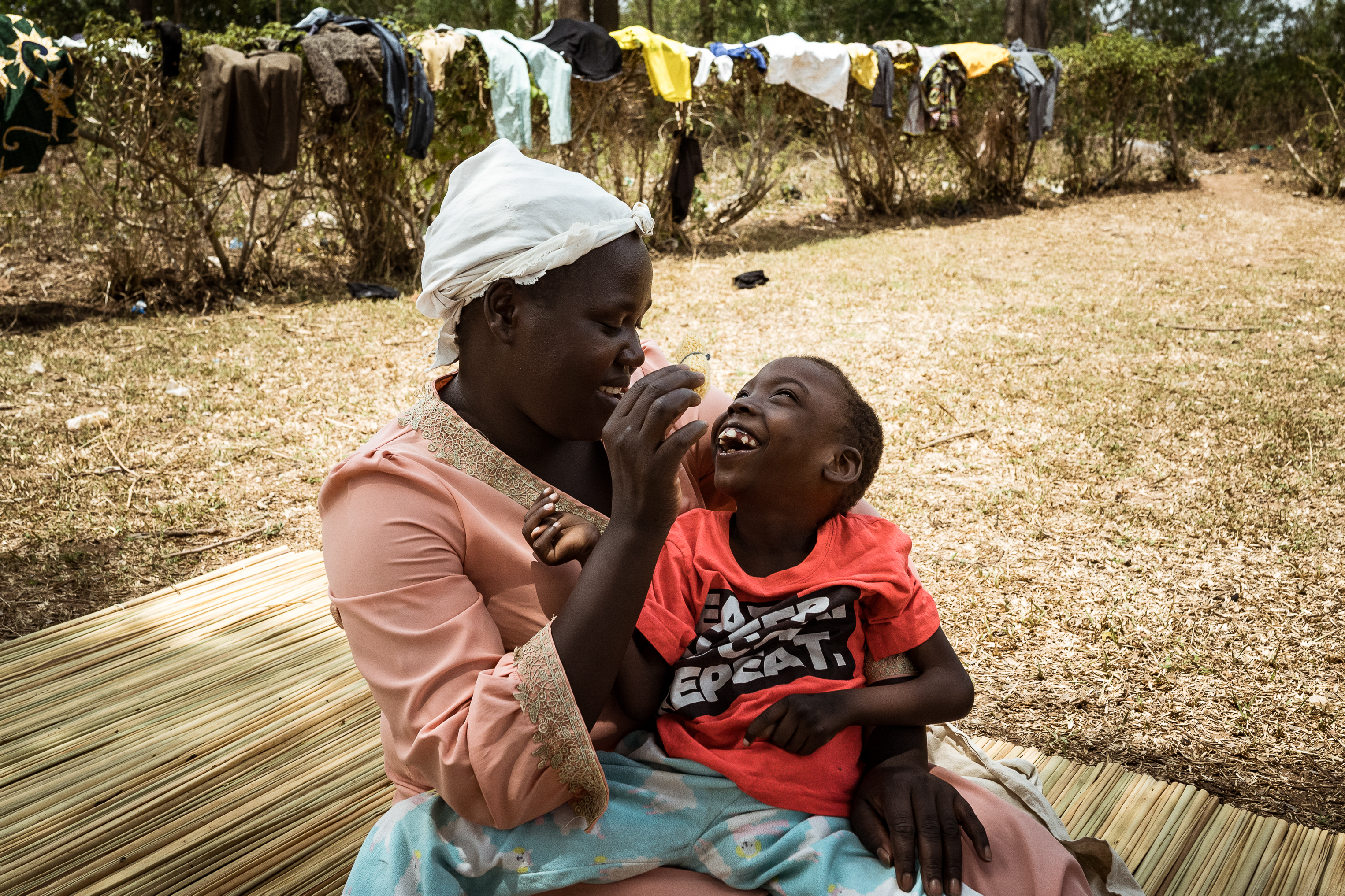 After bathing Aaron outside in the early afternoon, she dries his bony frame with a towel as her family’s chickens and goats wander over. She sits on a mat on a patch of grass outside their hut, wraps him in the towel and holds him, her face beaming, before she pulls a T-shirt over his head and dresses him in clean pants. They play peekaboo, Aaron giggling and his eyes lighting up as she reappears.