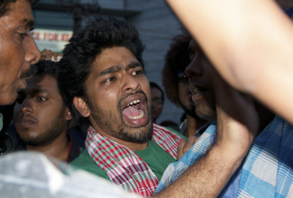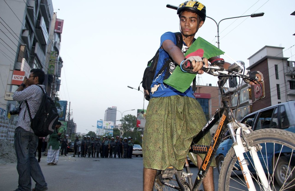 Moinal, a rickshaw driver with only one name, watched the protesters but said he had no idea what was going on. “I don’t know what this is, but I think it’s nice that the young generation is wearing the lungi,” he said.