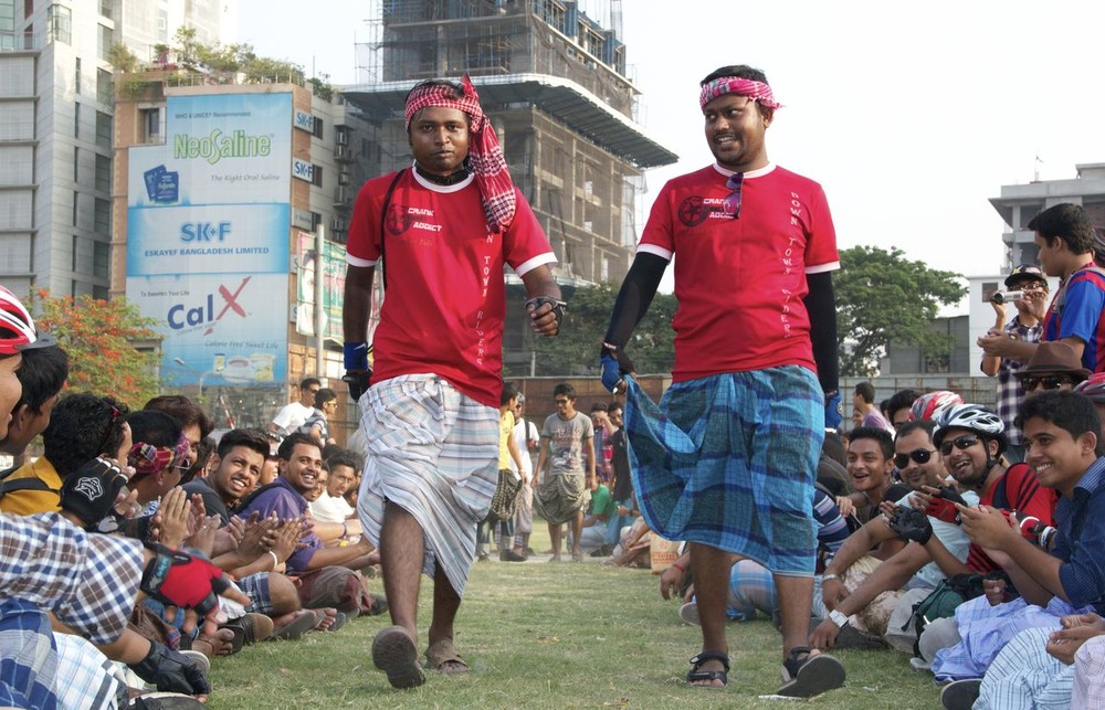 About 400 marchers – including students, young professionals and cyclists – protested the recent ban on rickshaw drivers from wearing the lungi in Baridhara, one of the most upmarket neighbourhoods in Dhaka.