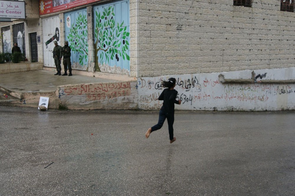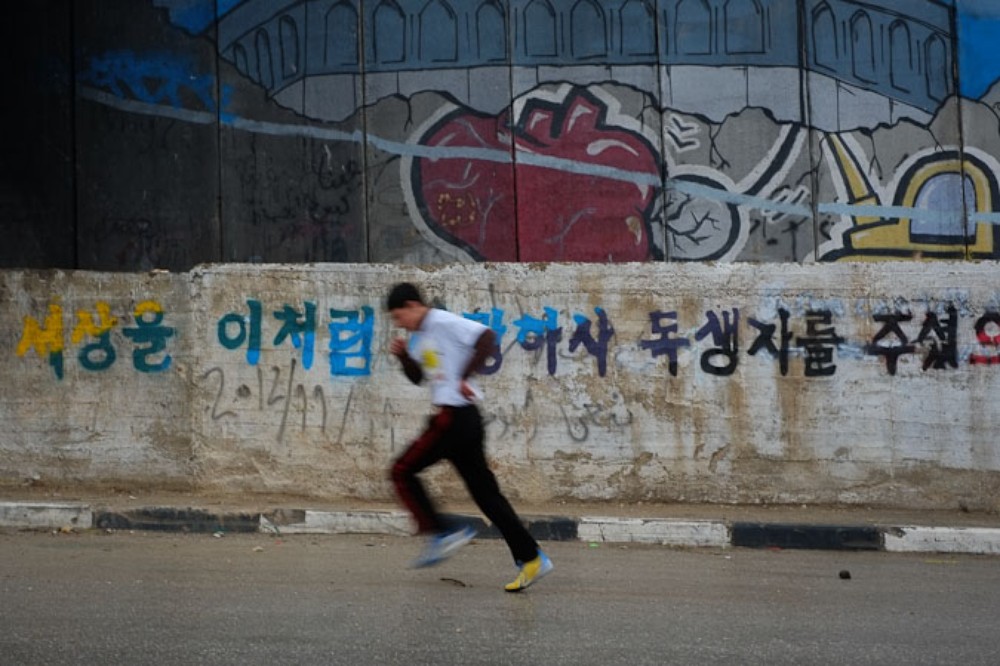 Some young Palestinian runners turned to the Israeli guard tower and made obscene gestures as they passed, highlighting the deep tensions that exist in the area.