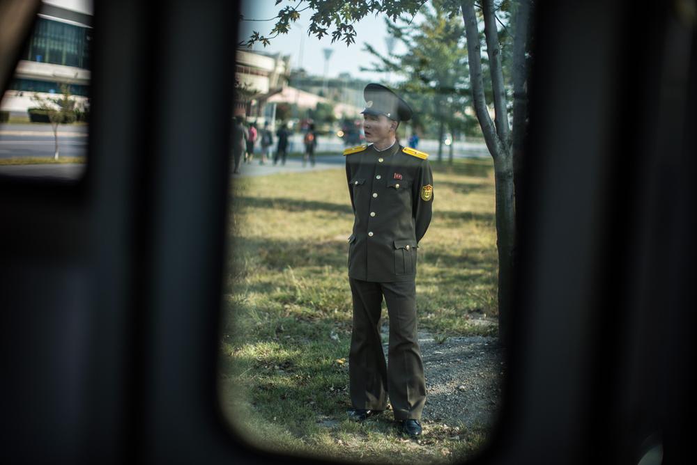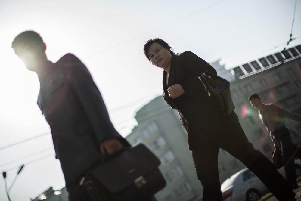 Buses are the mass transport of choice in this part of Pyongyang; old rusted ones from the 1960s share the road with brand new vehicles. Inside, silent passengers look out through mist-covered windows.