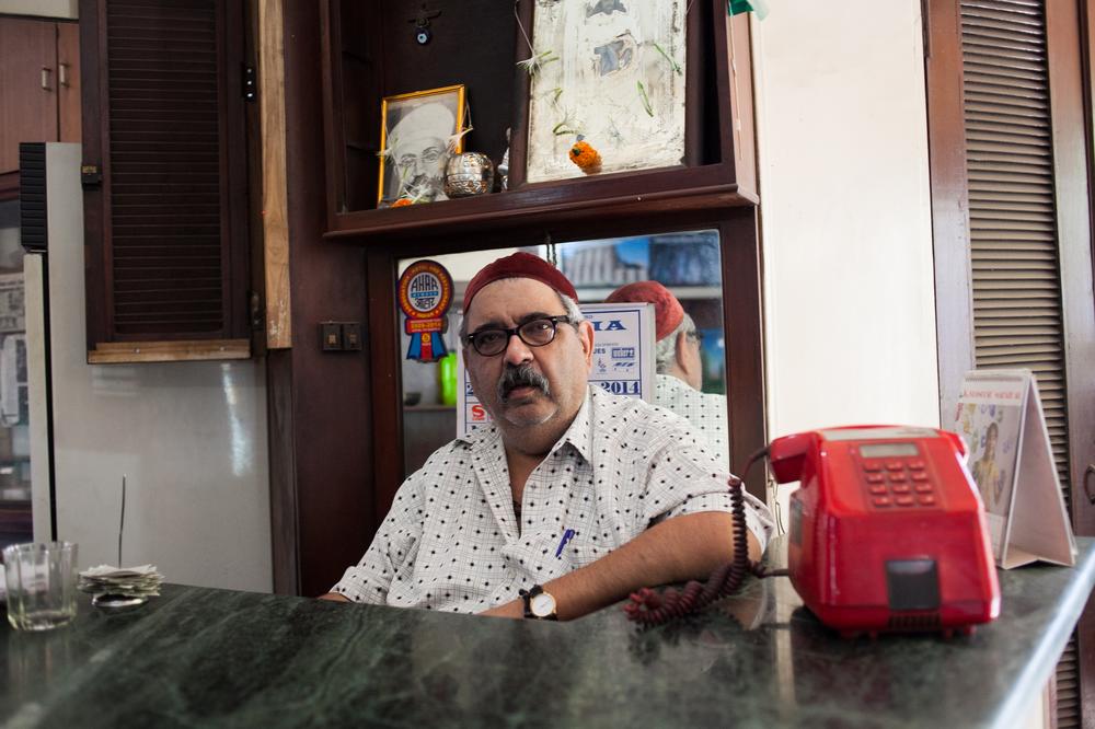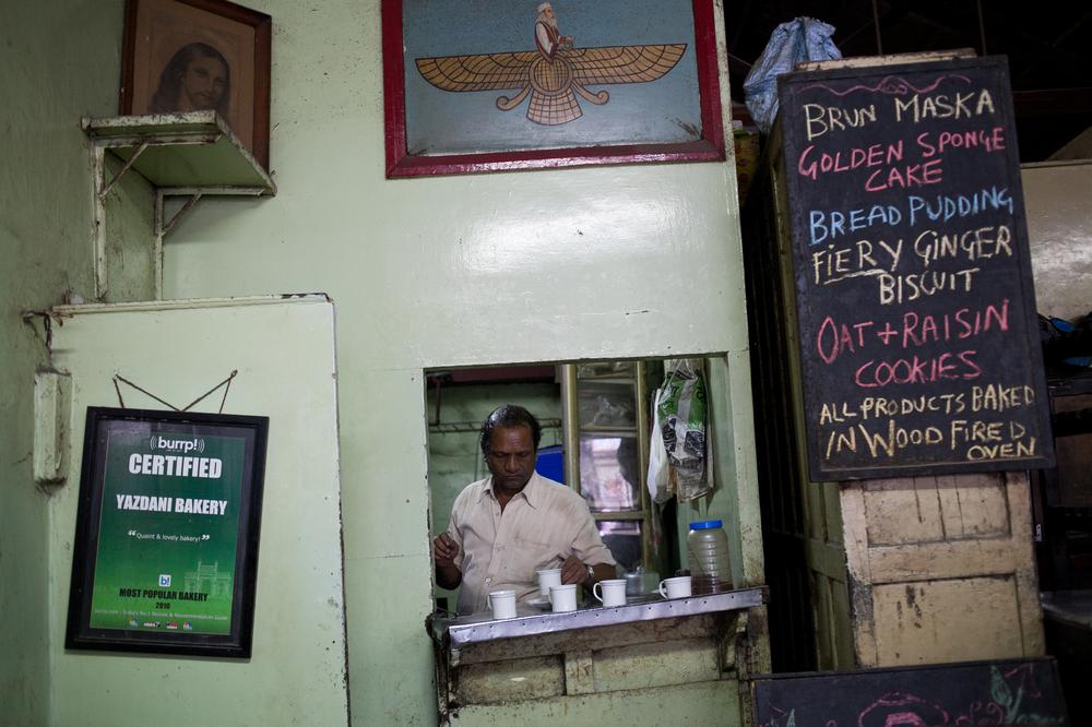 Meheraban Kola, one of the partners of the Sassanian Boulangerie, sits at the cash counter of the cafe which was started by his wife(***)s great-grandfather who migrated to India from Yazd in Iran
