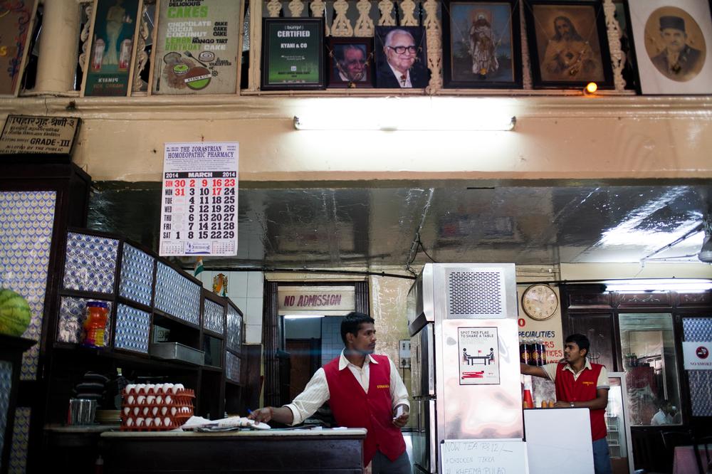 Waiters at work in Kyani & Co. as images of Parsi family members and religious icons adorn the walls above