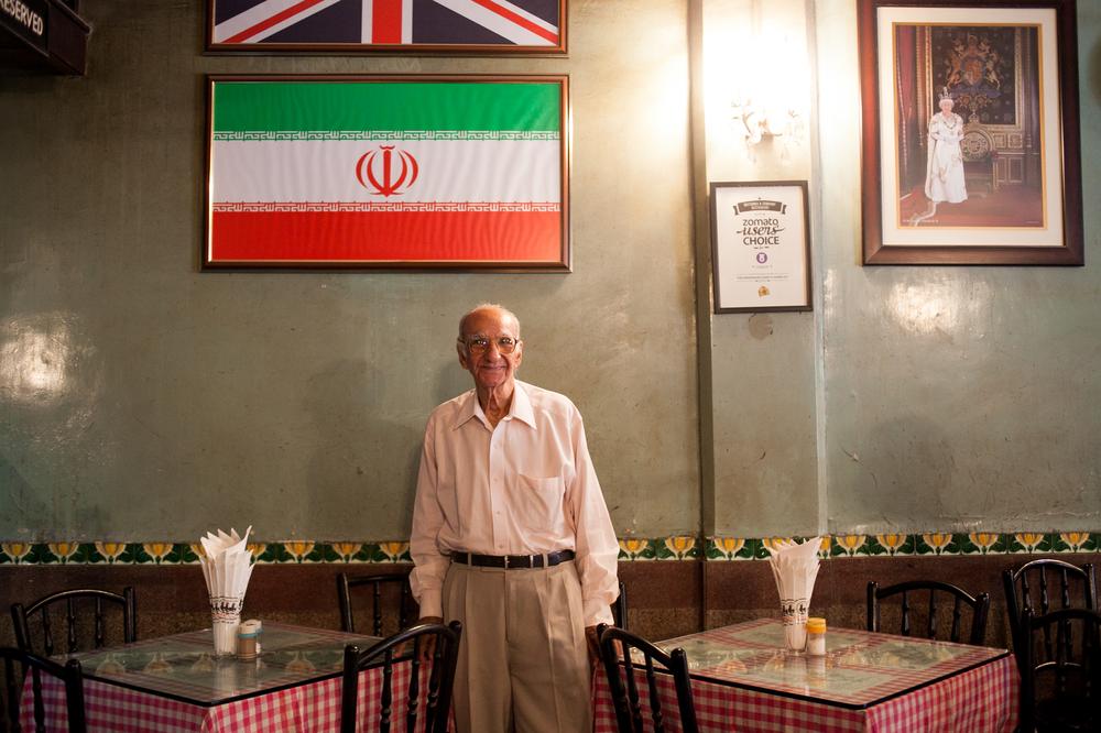 Ninety-two year old Boman Irani, partner of Britannia & Co. poses for a portrait in the restaurant with the Iranian and British flags hung above him and a portrait of Queen Elizabeth who had once visited the restaurant
