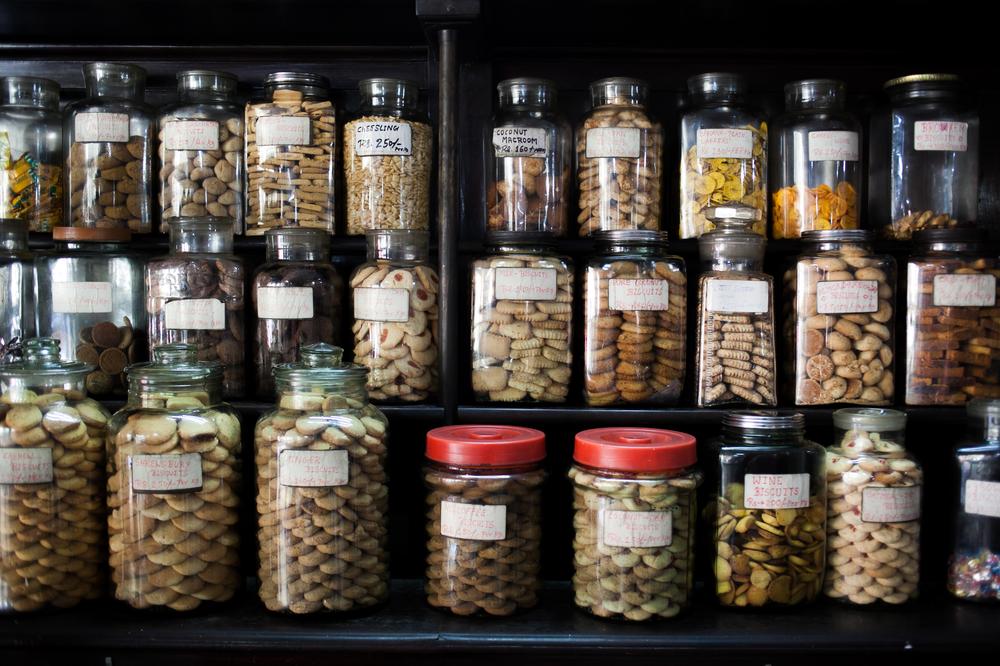 Biscuits and confectionery sit in glass jars on the shelf of an Irani cafe. Most Irani cafes in the city are popular for their , bread, cake and biscuits.