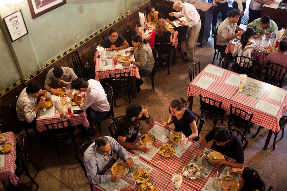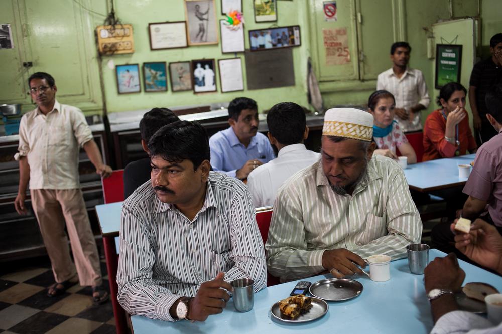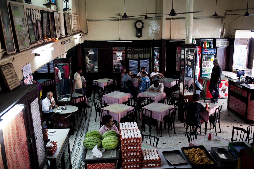 Customers dine at Kyani & Co. Most Irani cafes have high ceilings, bent wooden chairs, vintage clocks and posters