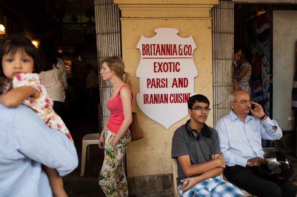 Customers wait in line to eat at Brittania & Co which has become an institution and a landmark in South Mumbai