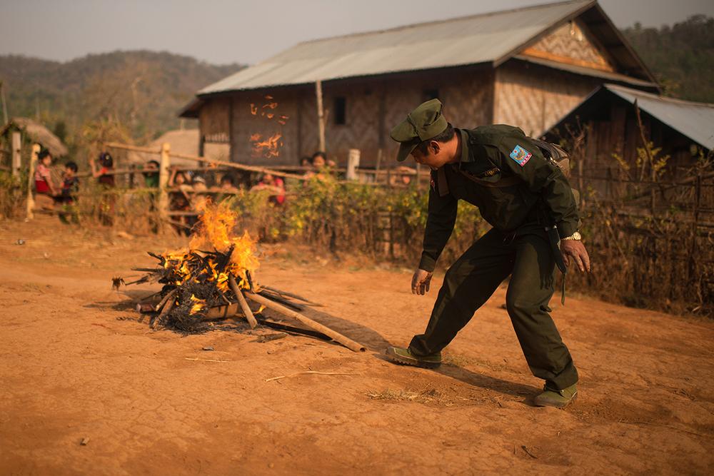 An officer with the Tang National Liberation Army (TNLA) holds a bunch of poppy flowers. Fifteen soldiers under his command destroyed a field of poppy plants in 40 minutes.
