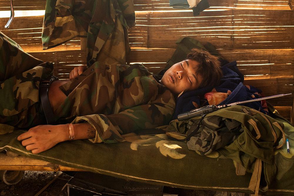 The TNLA started a drug eradication campaign in 2012, destroying opium fields and punishing drug addicts and traffickers. Above, a TNLA soldier naps in his hut.