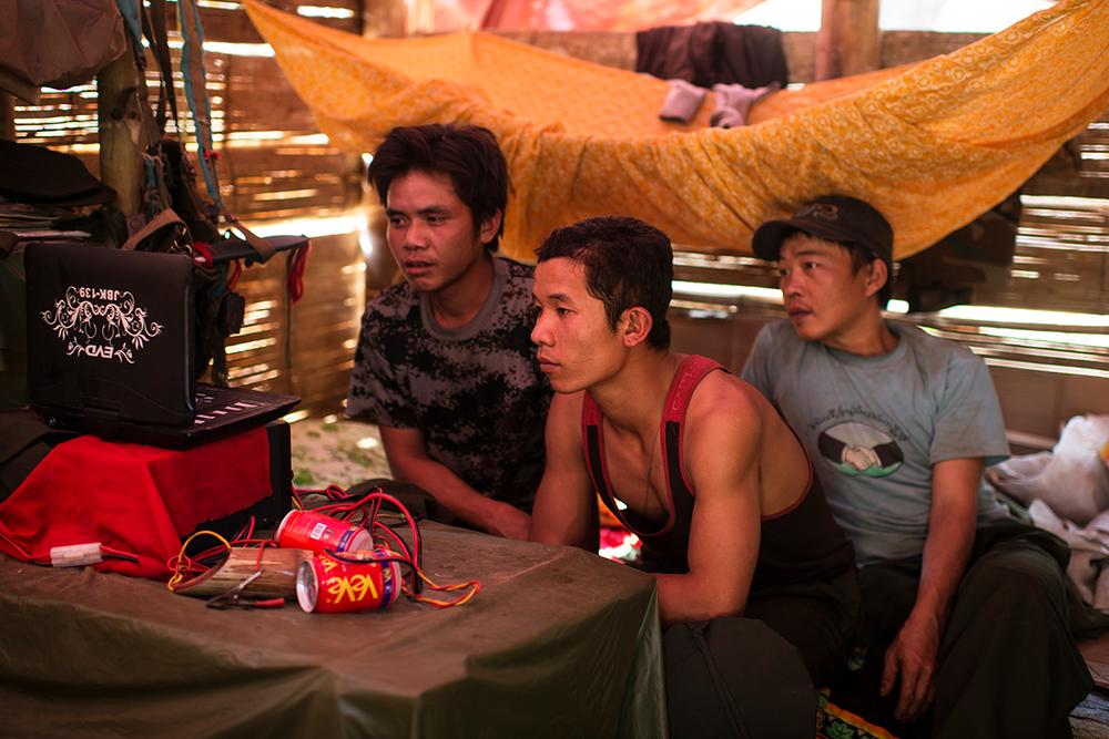 TNLA soldiers relax by watching a movie at a base camp. The group(***)s strategy is based on mobility, with no permanent headquarters and small groups of soldiers constantly on the move.