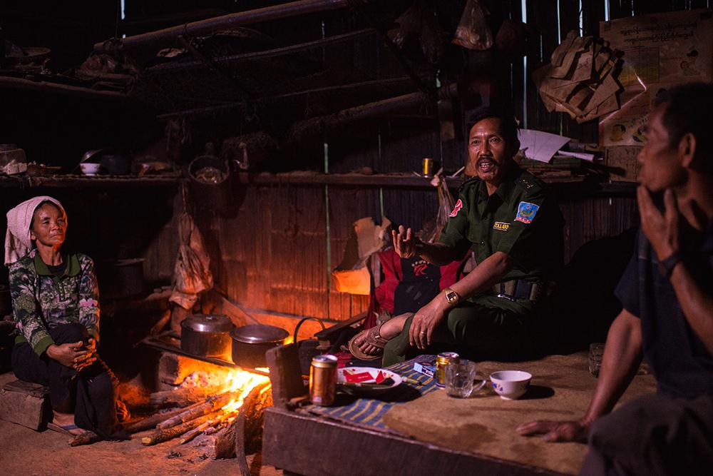 Tar Khoure Nyan, a high-ranking TNLA officer, speaks with a villager in northern Shan state.