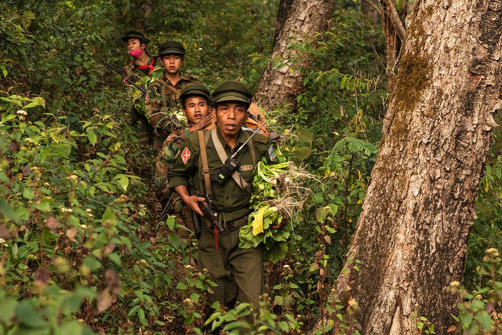 TNLA soldiers leave the forest after destroying a poppy field. Poppy leaves, which are innocuous, were collected to be used in a soup.
