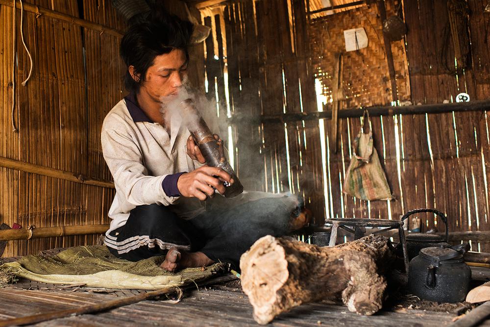 Aikun, a 29-year-old Palaung man, smokes an opium pipe in his bamboo hut. By smoking, he risks imprisonment by the TNLA.