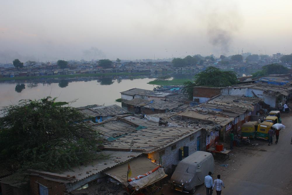 Approach road to Millatnagar where Maninagar(***)s famed roads give way to dusty streets full of potholes. The area is surrounded by factories which emit poisonous and toxic smoke. It’s difficult to breathe normally particularly in the evening due to smoke.