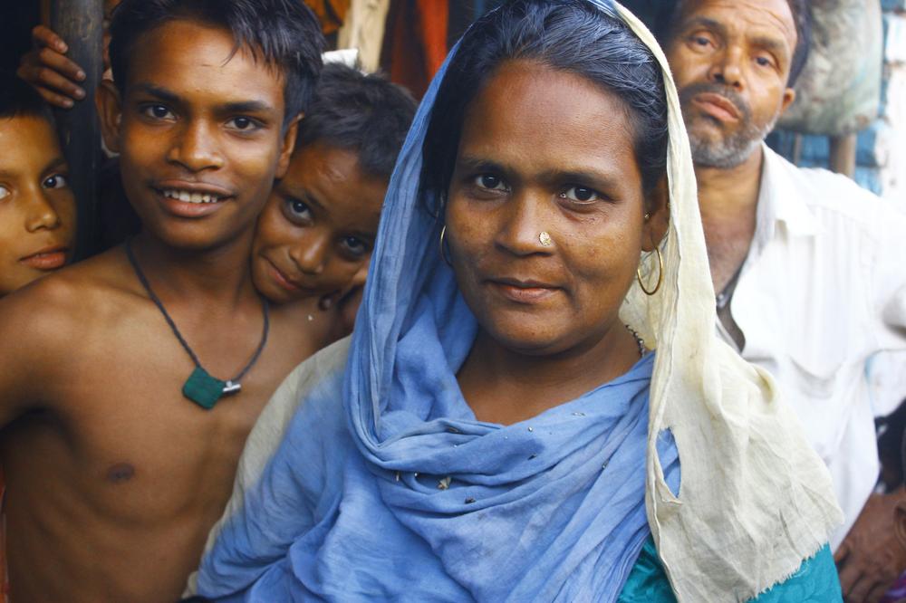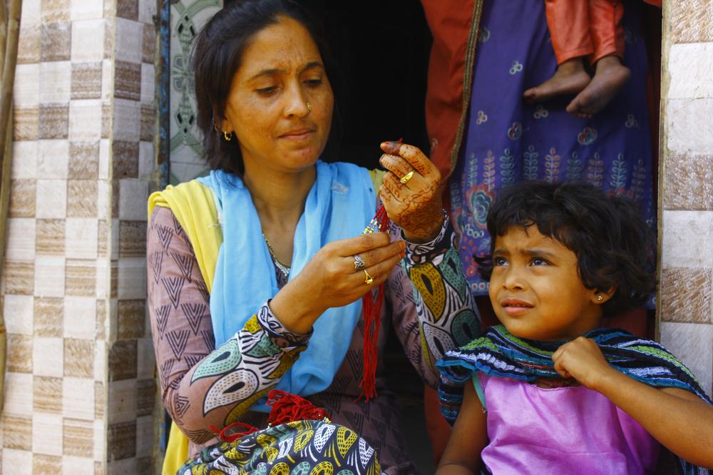 Citizen Nagar resident Reshmaben, 58, is with her granddaughter at their one-room house. She is an eyewitness to Naroda Patiya massacre case in which 98 people of the minority community were killed. She makes a "rakhi" that is used during Hindu festival of Raksha Bandhan. She complains of skin diseases because their house is near the city’s largest garbage yard.