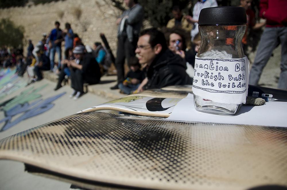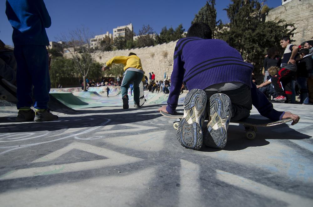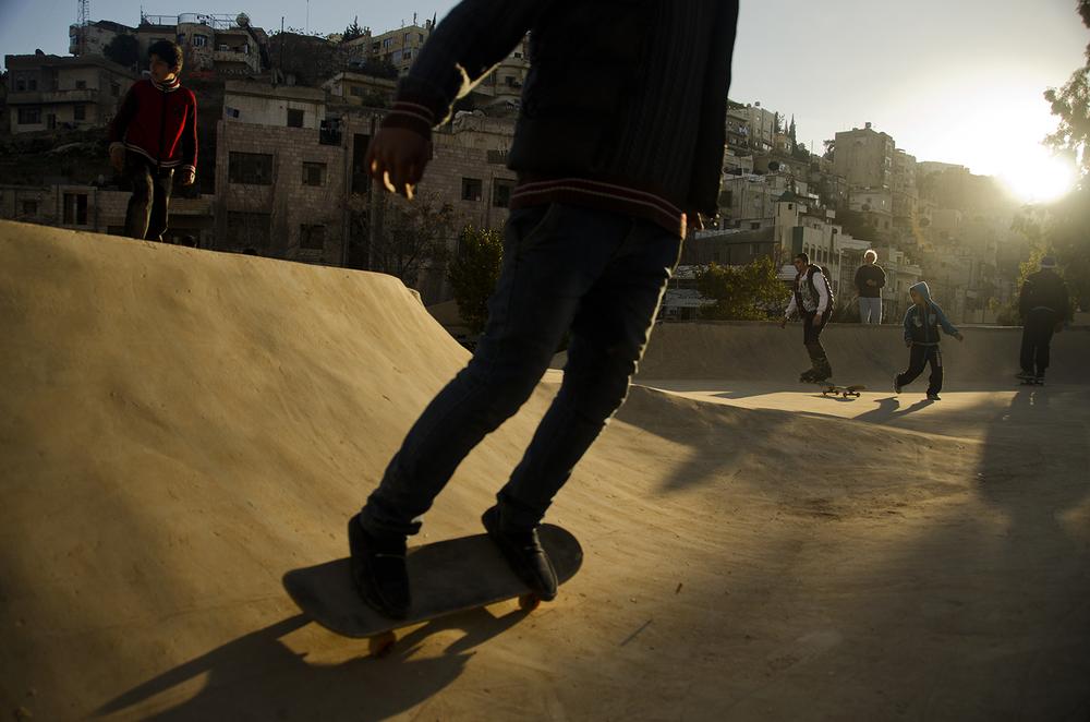 Amman, Jordan– On a warm afternoon in downtown Amman, a Syrian refugee is cheered on via loudspeaker as he weaves his skateboard through a makeshift course of rain boots and traffic cones during a competition at the newly opened 7Hills skate park.