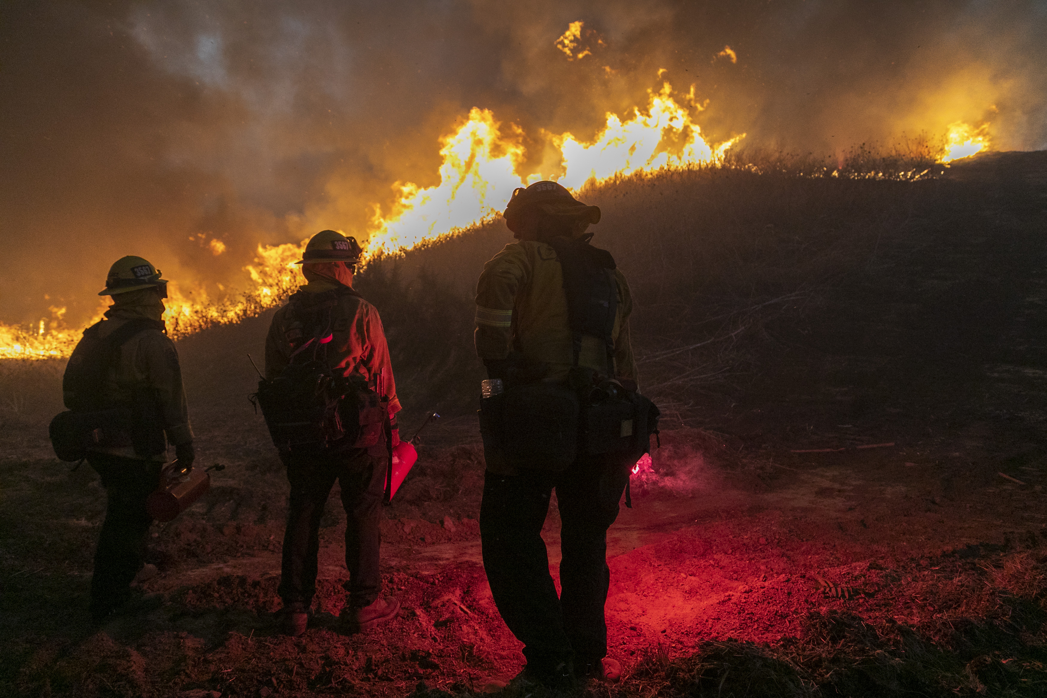 Firefighters set a backfire to protect homes and to try to contain the Blue Ridge fire. [David McNew/Getty Images/AFP]