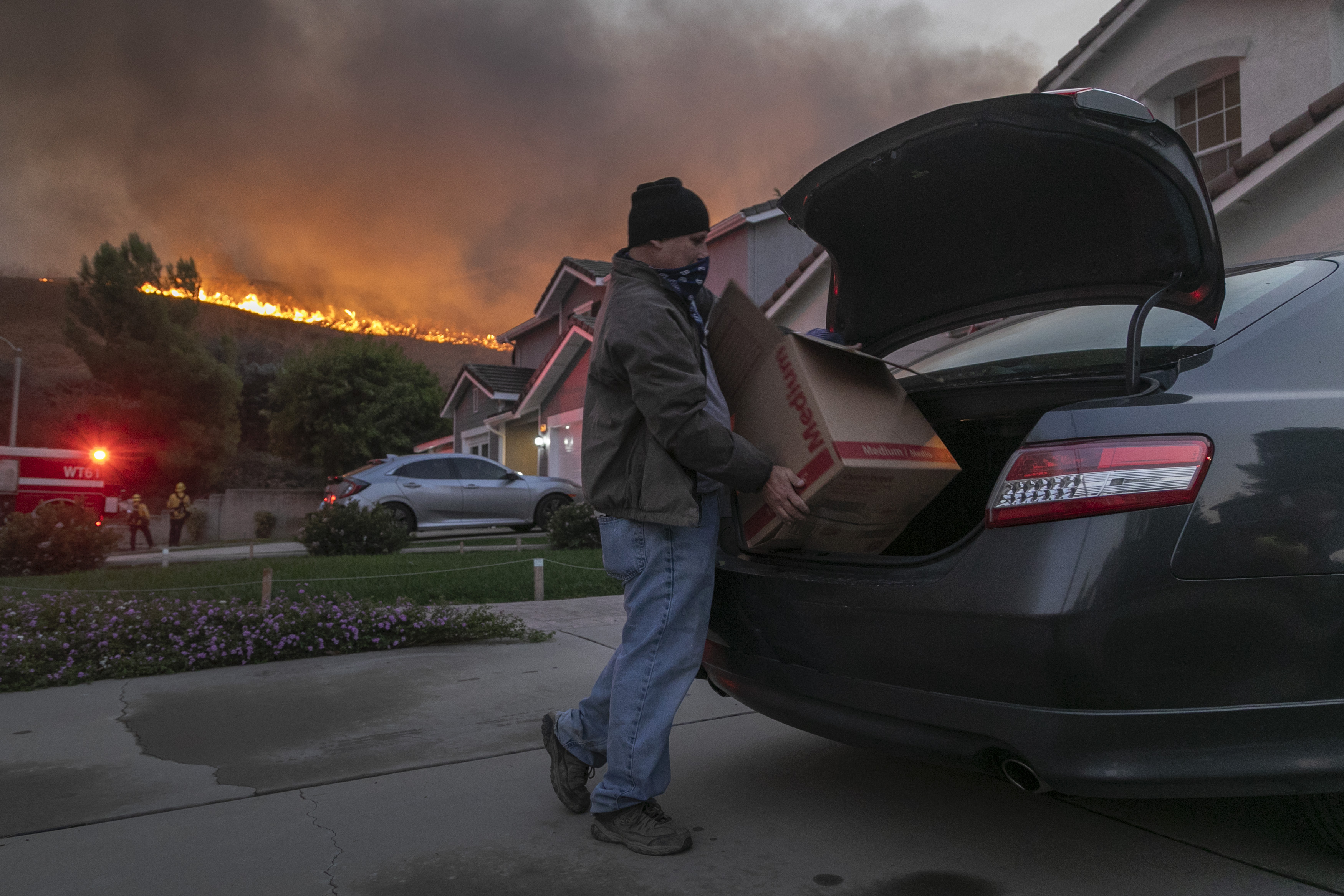 A man evacuates as flames come close to houses in Chino Hills, California. [David McNew/Getty Images/AFP]