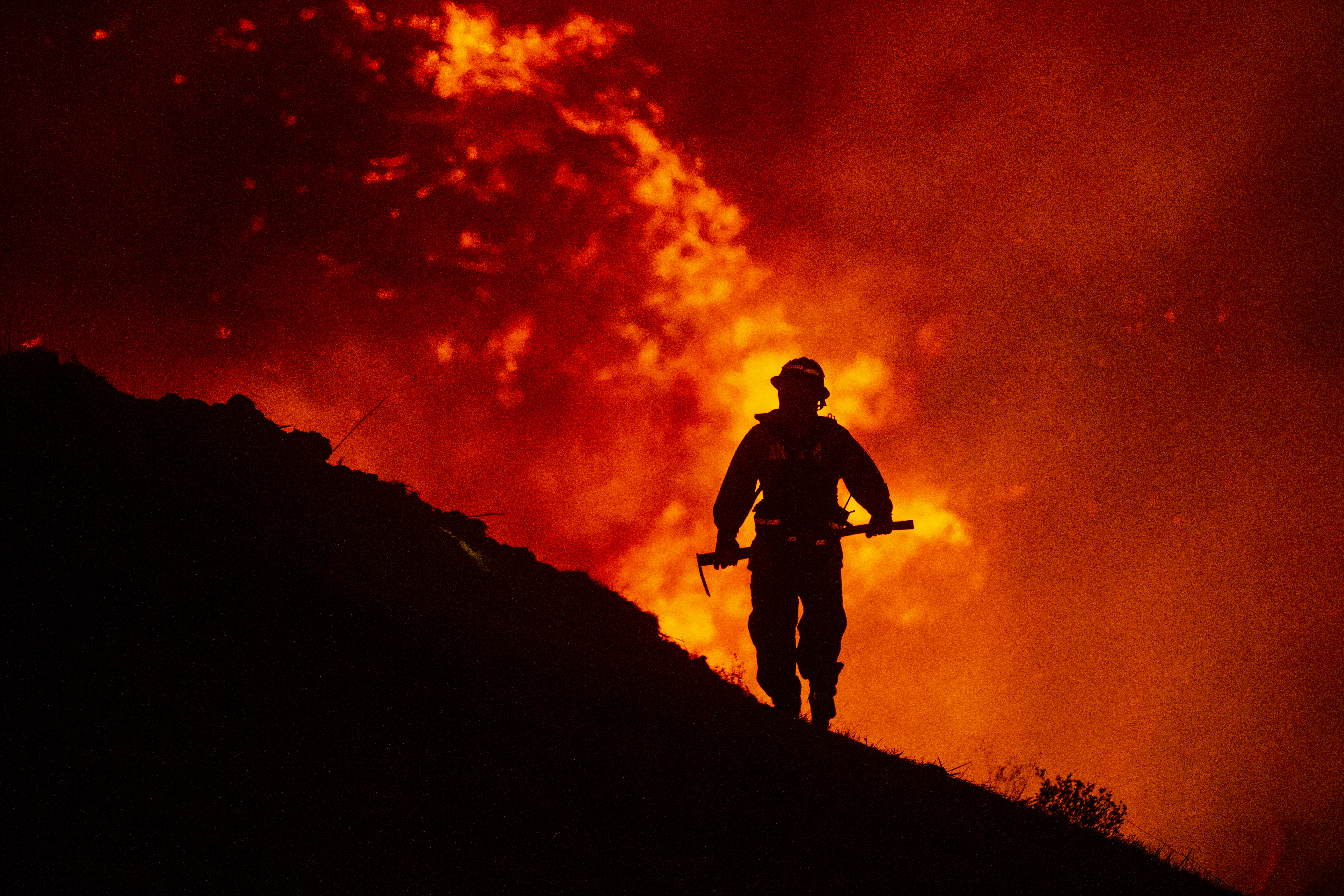A firefighter works at containing the Blue Ridge fire as it spreads in the hills near homes in Chino Hills, California. [Etienne Laurent/EPA]