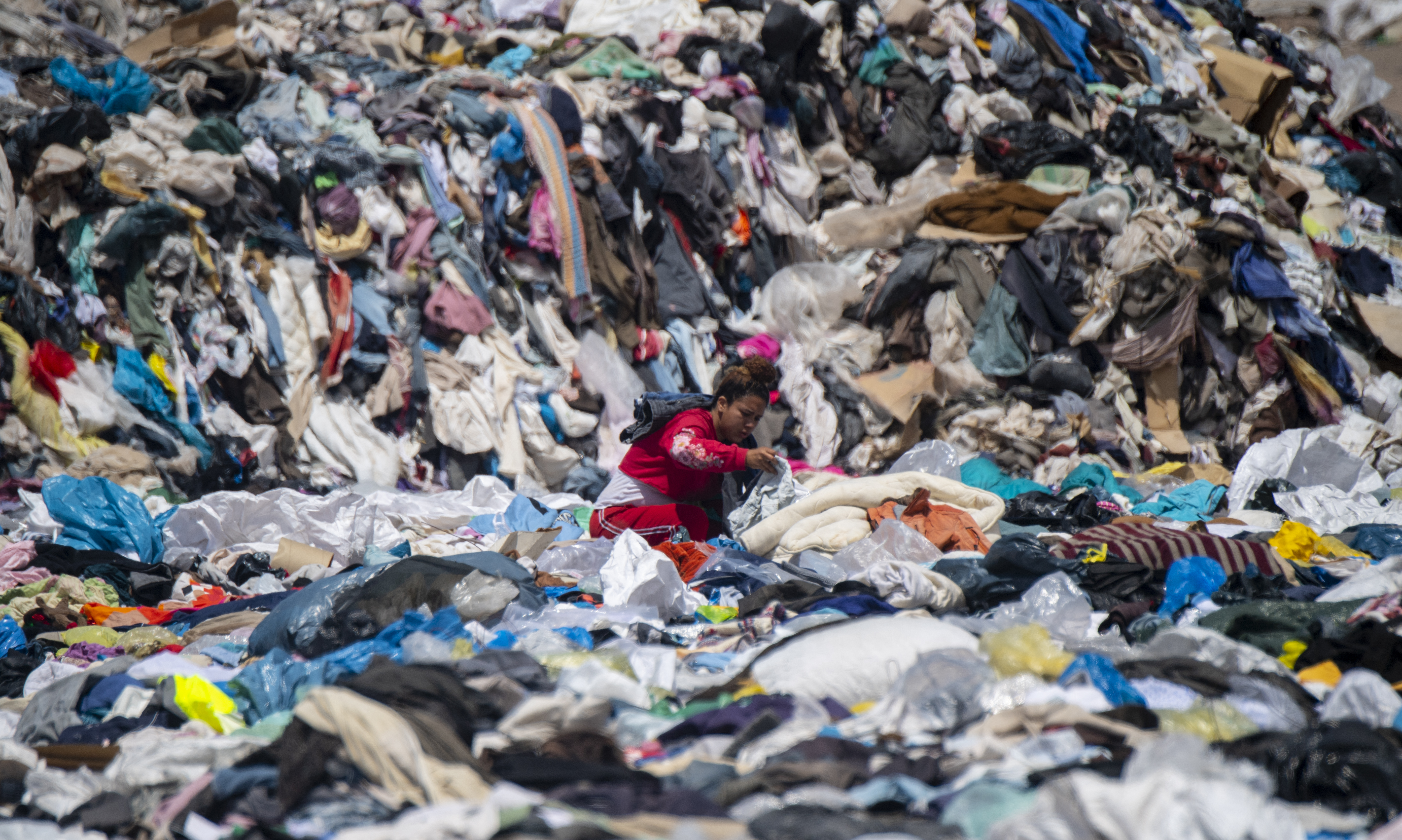A woman searches for used clothes amid tonnes discarded in the Atacama Desert. Clothing, either synthetic or treated with chemicals, can take 200 years to biodegrade and is as toxic as discarded tyres or plastic materials. [Martin Bernetti/AFP]