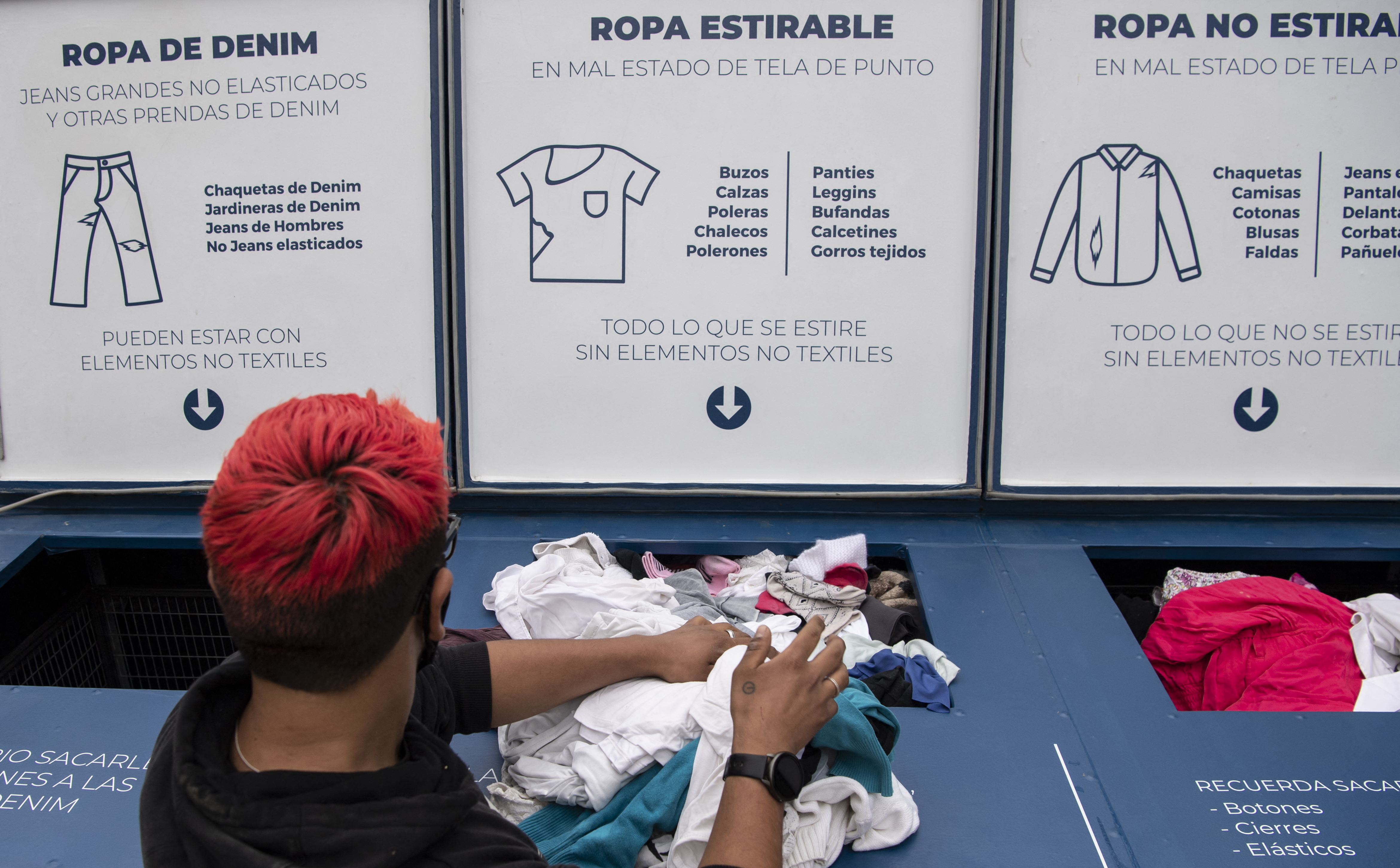 A man discards used clothes at a container of the Ecotex ecologic yarn factory in Santiago. [Martin Bernetti/AFP]