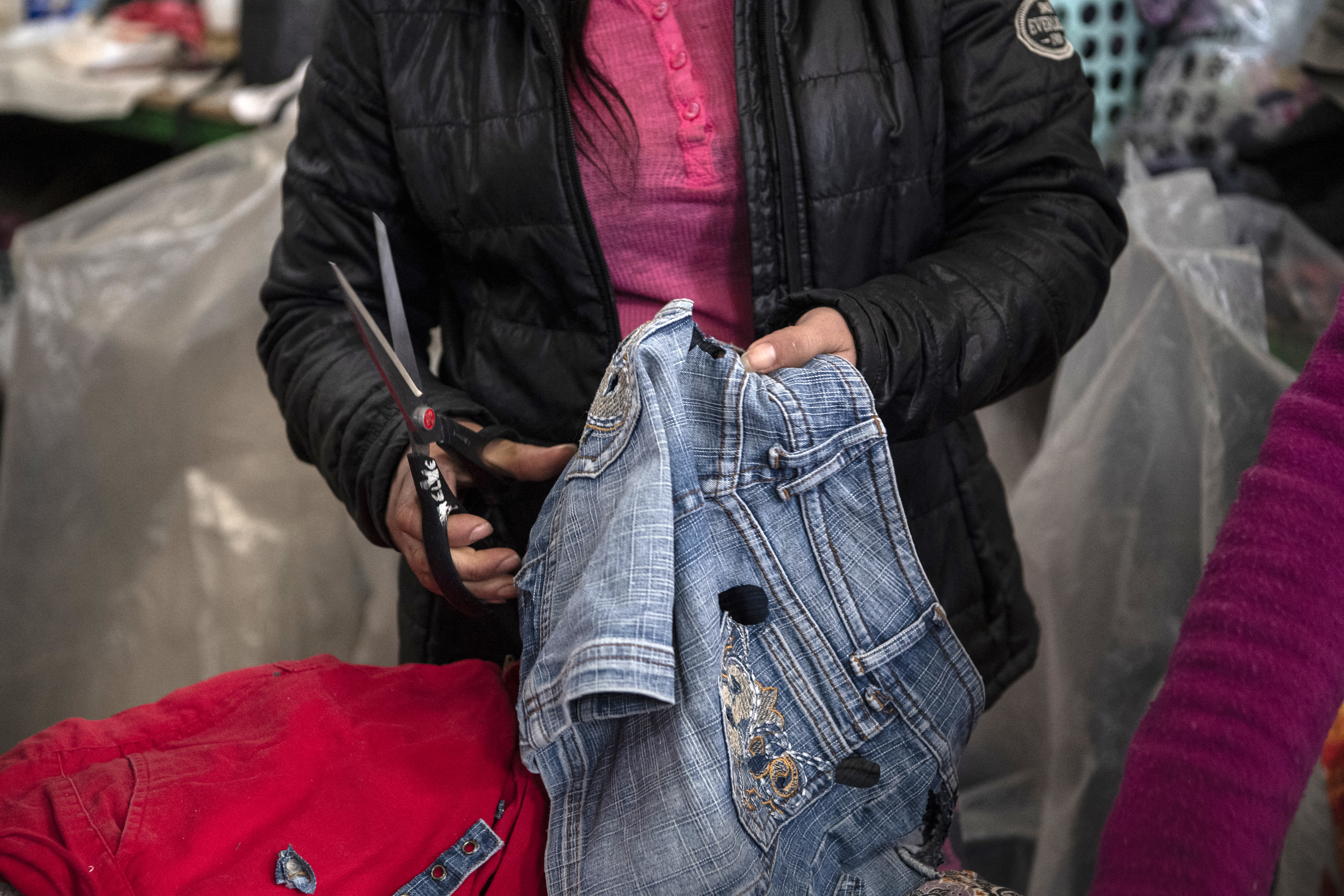 A worker rips metal buttons off a pair of jeans at a recycling factory. [Martin Bernetti/AFP]