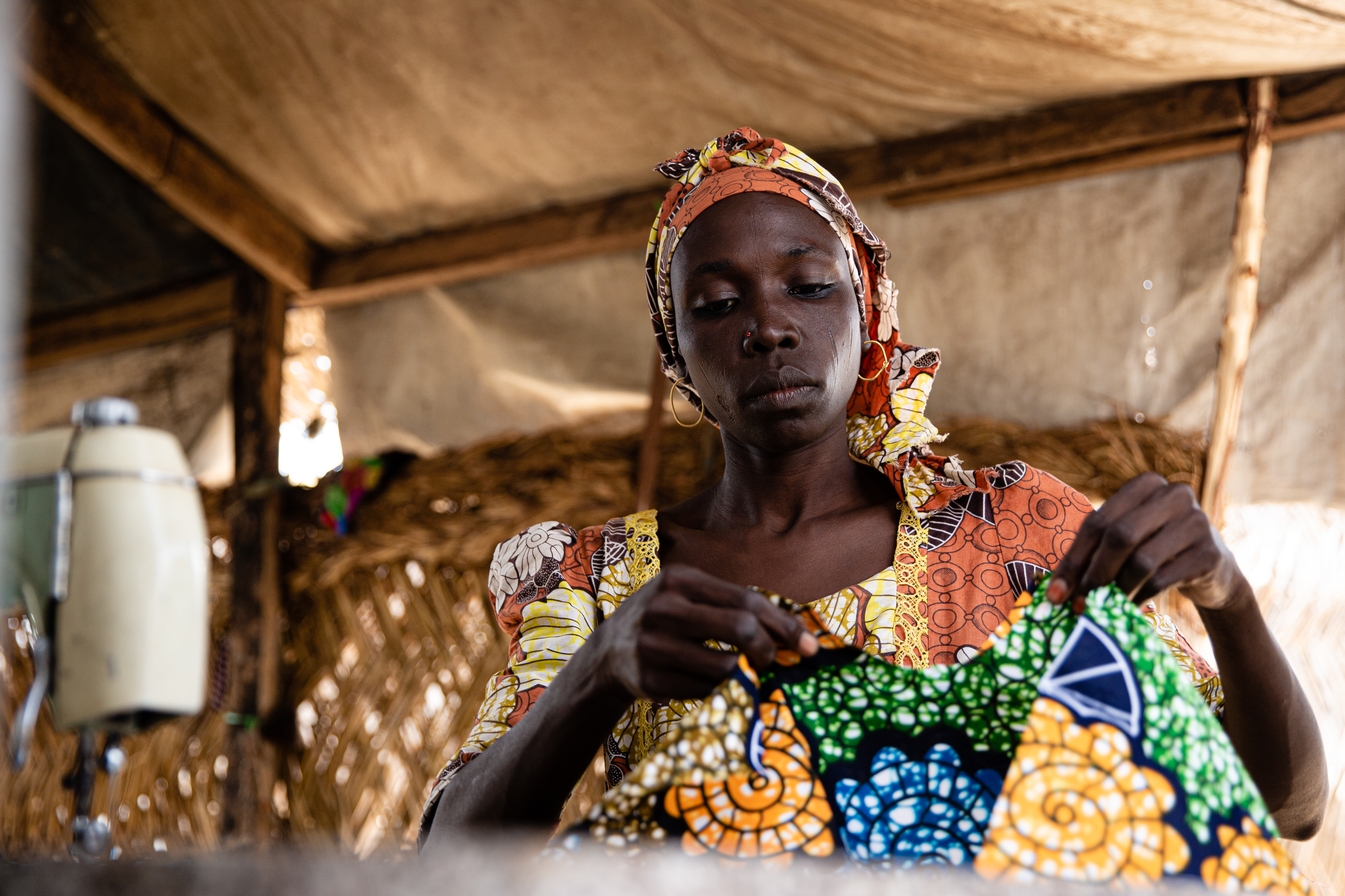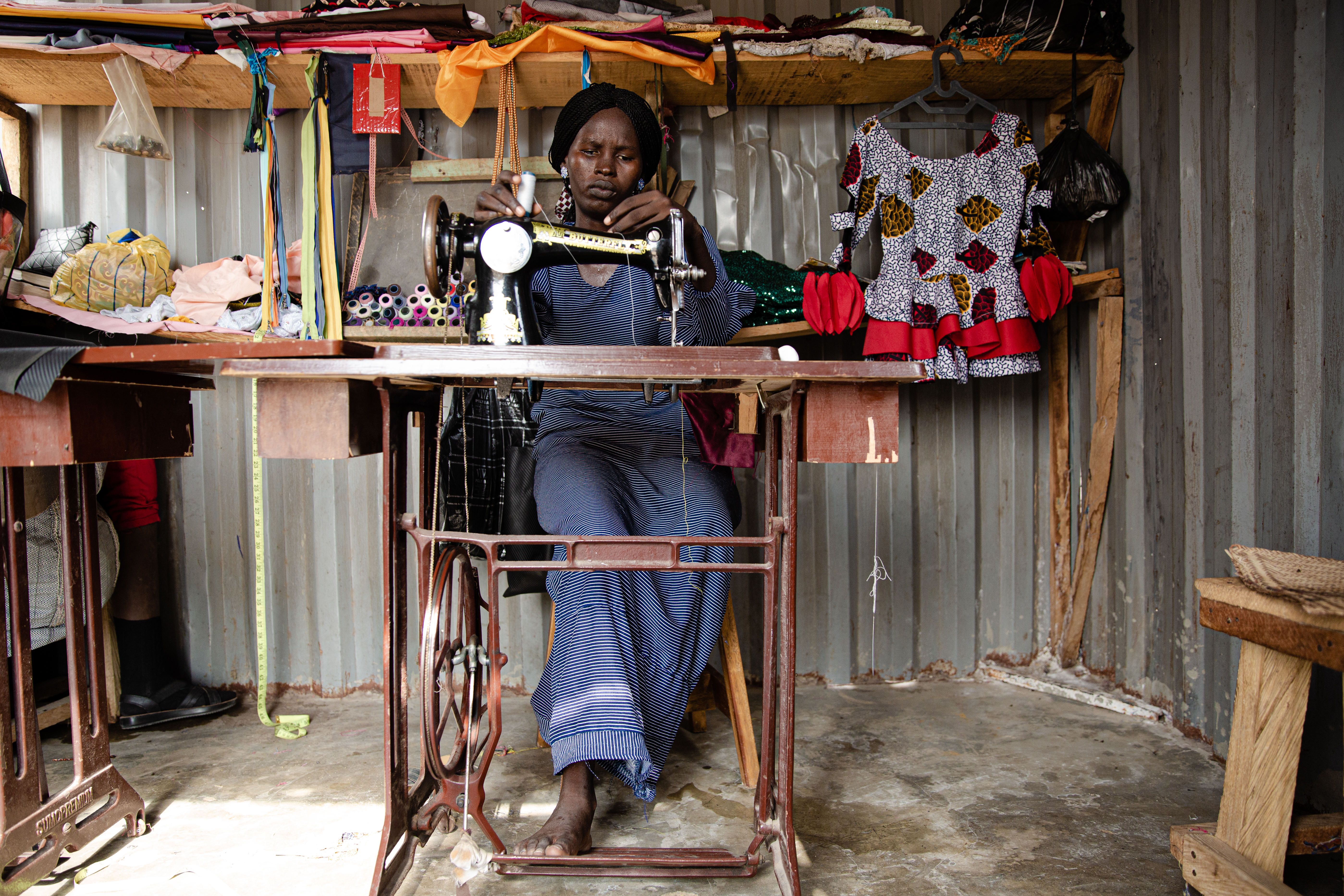 In the flat, colourless landscape of the displacement camp – the miles of sand interrupted only by rows of identical tarpaulin tents and huts – a young woman sews a bright pink dress.