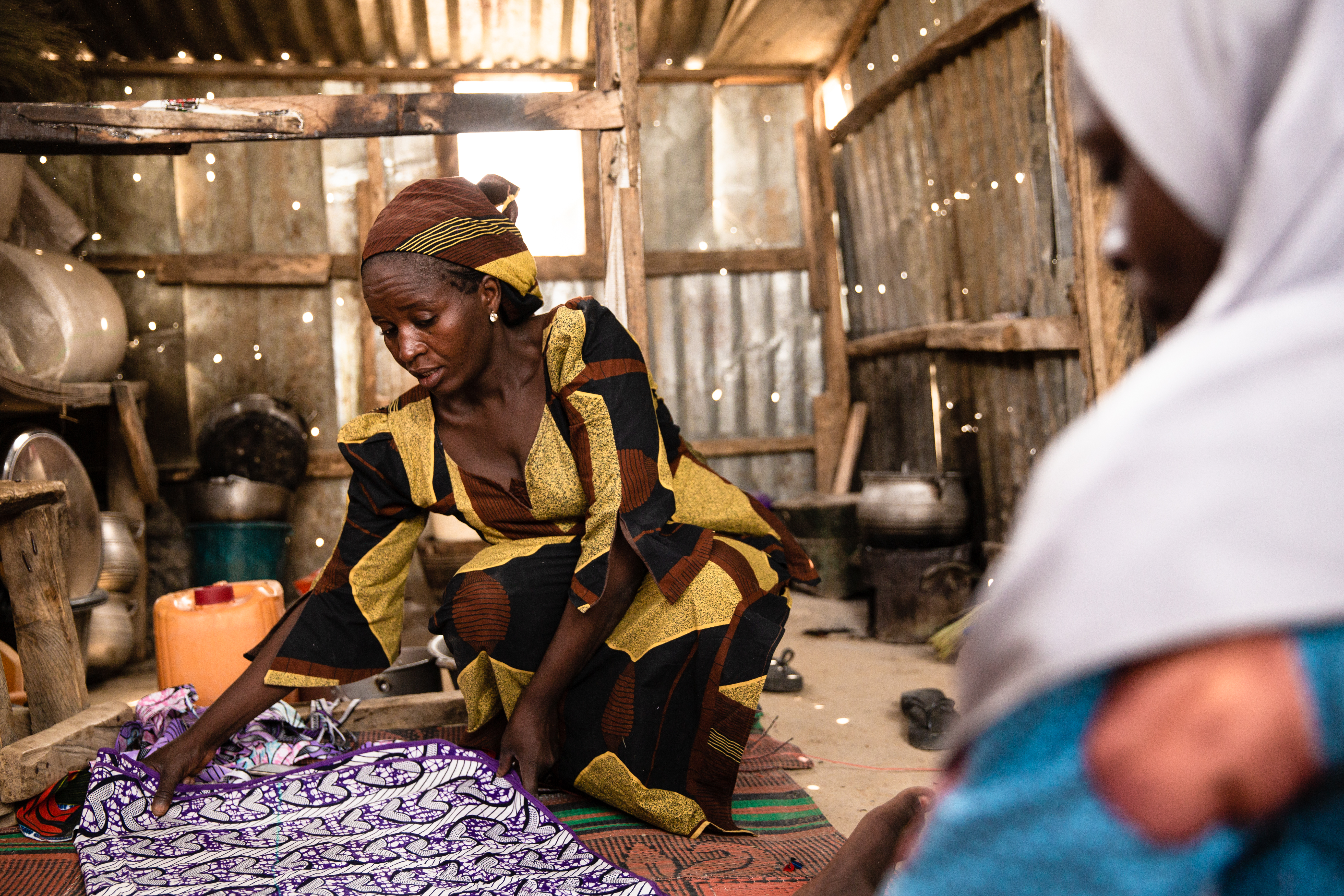 In her house in the Bakassi camp in Maiduguri, Aishatu Mohammed, 38, a widow and a mother of 10, is teaching her teenage daughter to sew. “She has to learn how to do things to be independent,” the soft-spoken Aishatu says. Sunlight pierces through the holes in the tarpaulin ceiling above their heads, while the two women, mother and daughter, sit barefoot on the plastic mat, repositioning and cutting a piece of bright purple fabric. It’s the middle of the dry Harmattan season and clouds of white dust hover above the scorched, naked earth.