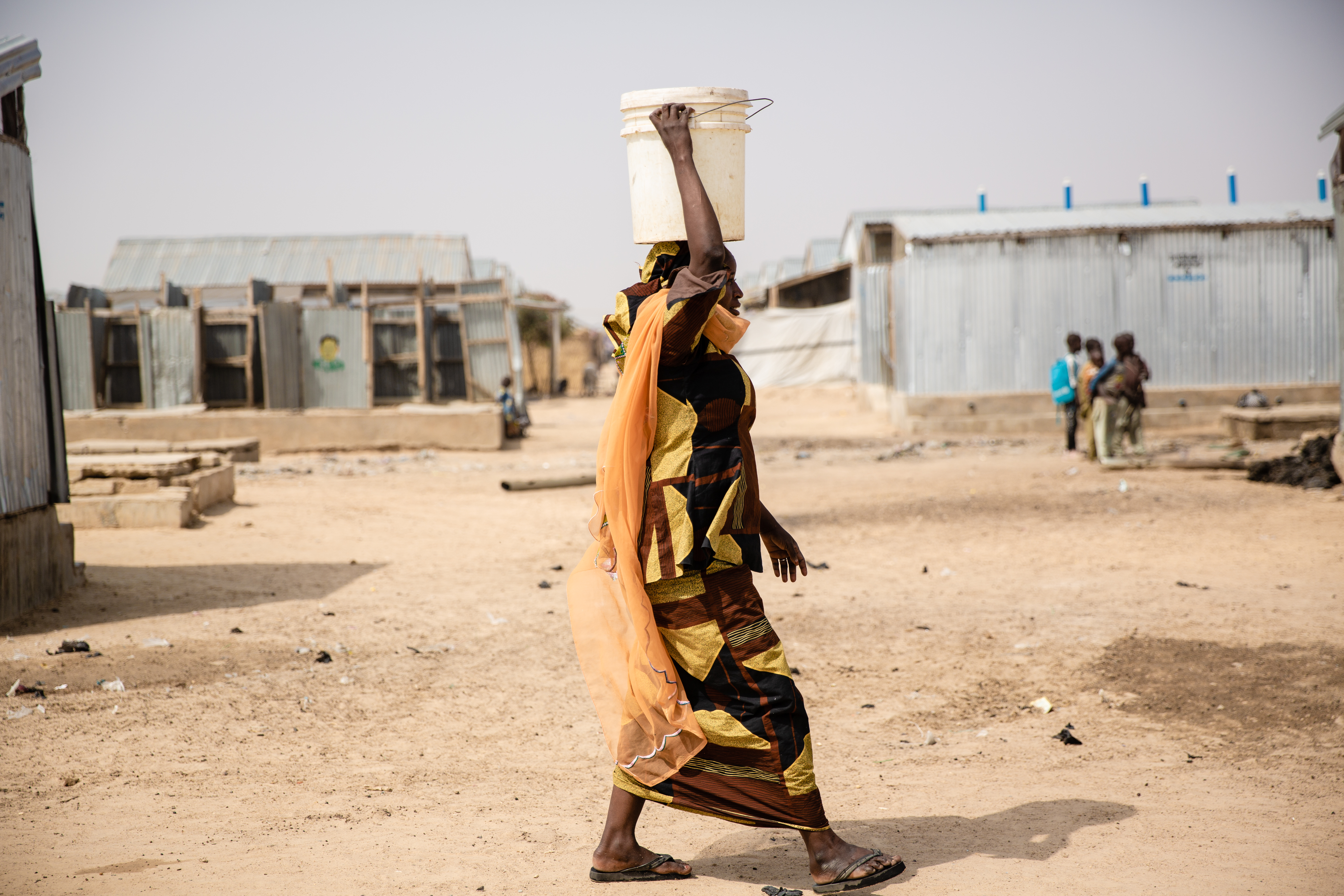 After she’s done speaking, Aishatu goes to fetch water at a nearby water point. She wears a long, fitted skirt, a top and a headscarf, all made from the same bright yellow fabric. A long orange gauze shawl is wrapped around her neck and floats behind her in the wind. On her head is a large plastic bucket filled with water; she carries it effortlessly, as if it weighs nothing at all.