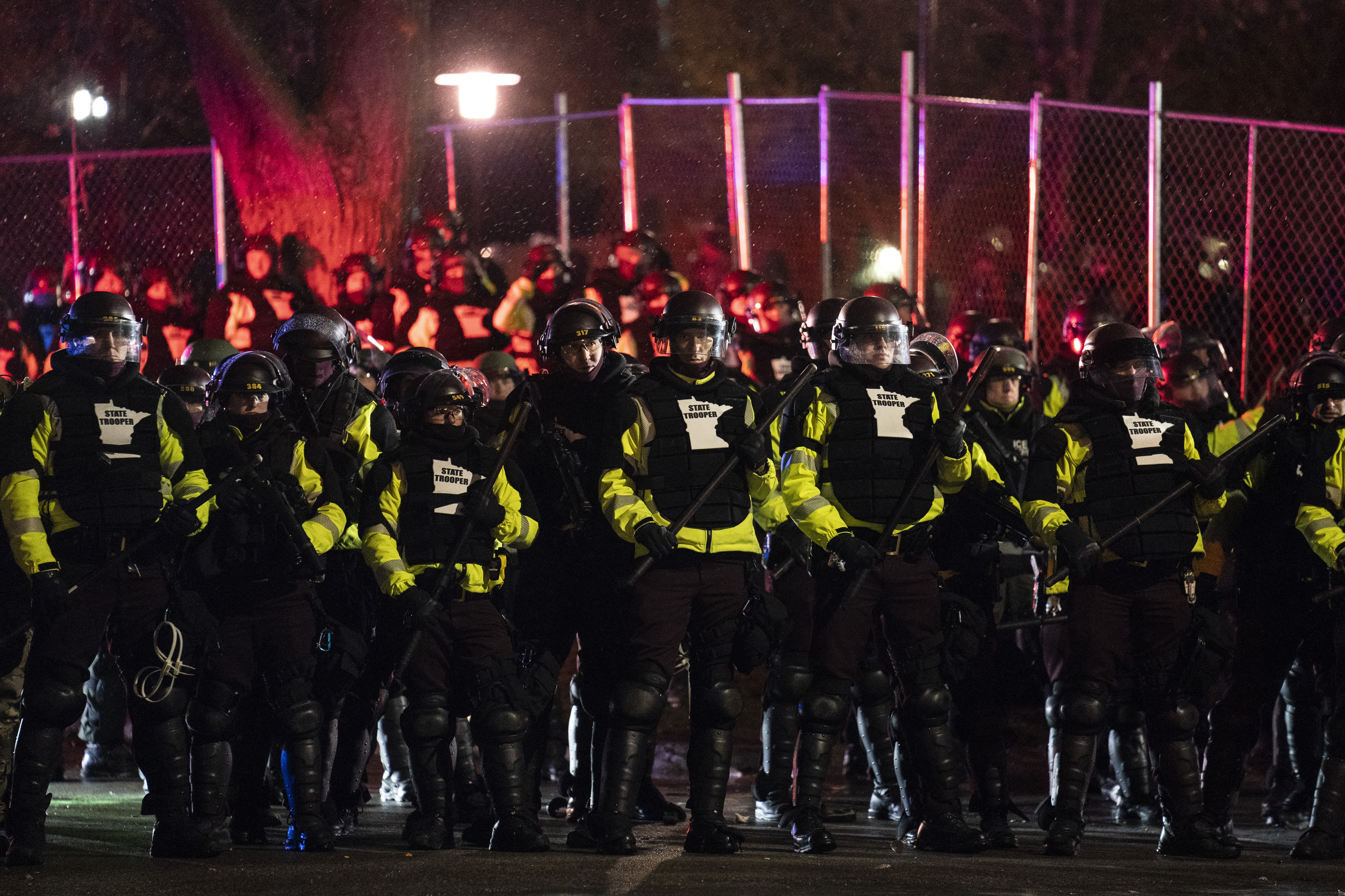 A long line of police in riot gear, rhythmically pushing their clubs in front of them, began slowly forcing back the remaining crowds.