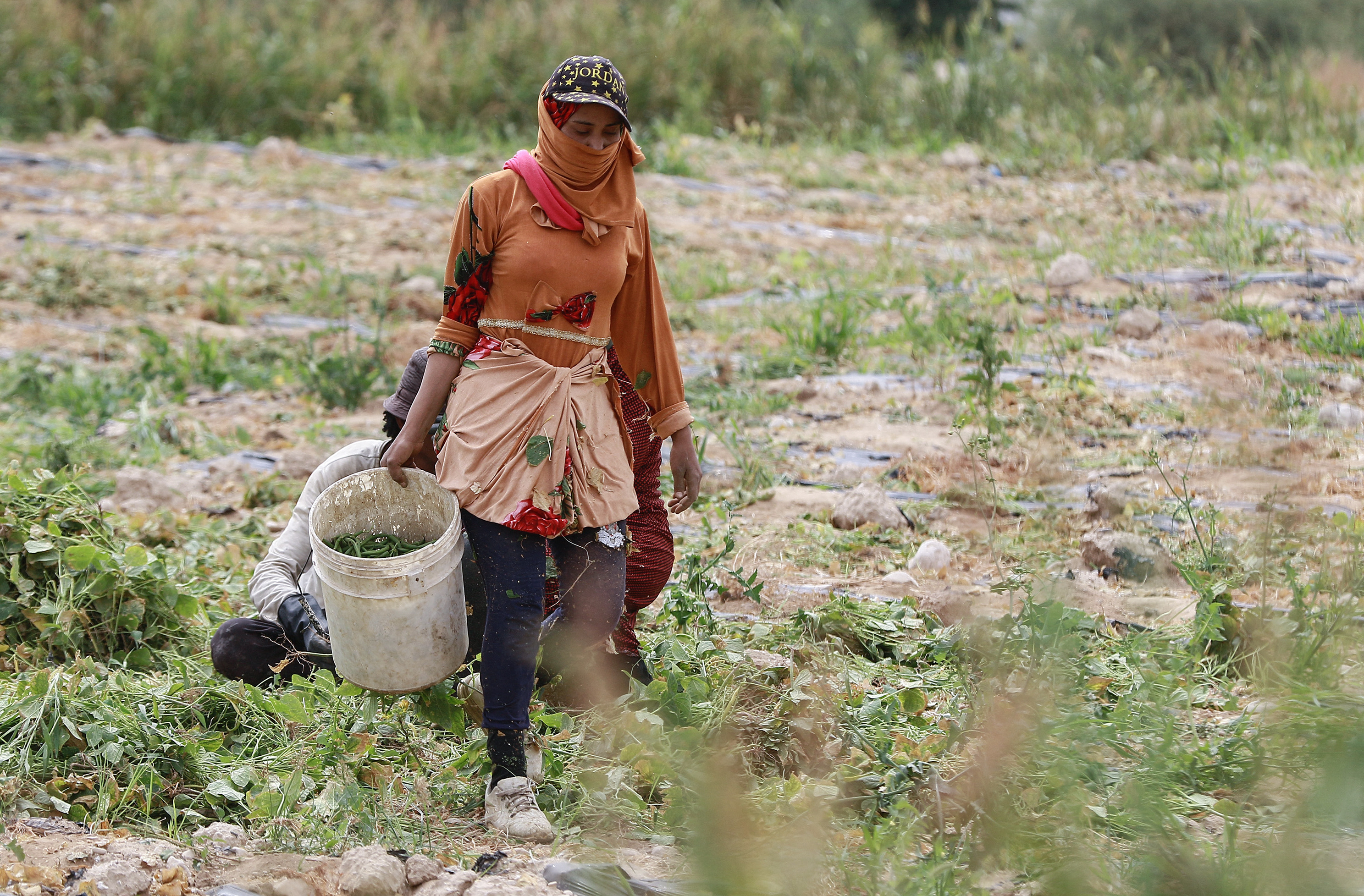 On a nearby nine-hectare (22-acre) farm, 43-year-old Ibrahim Dgheimat sits in his pickup, overwhelmed by the heat. He watches as several women pick beans.