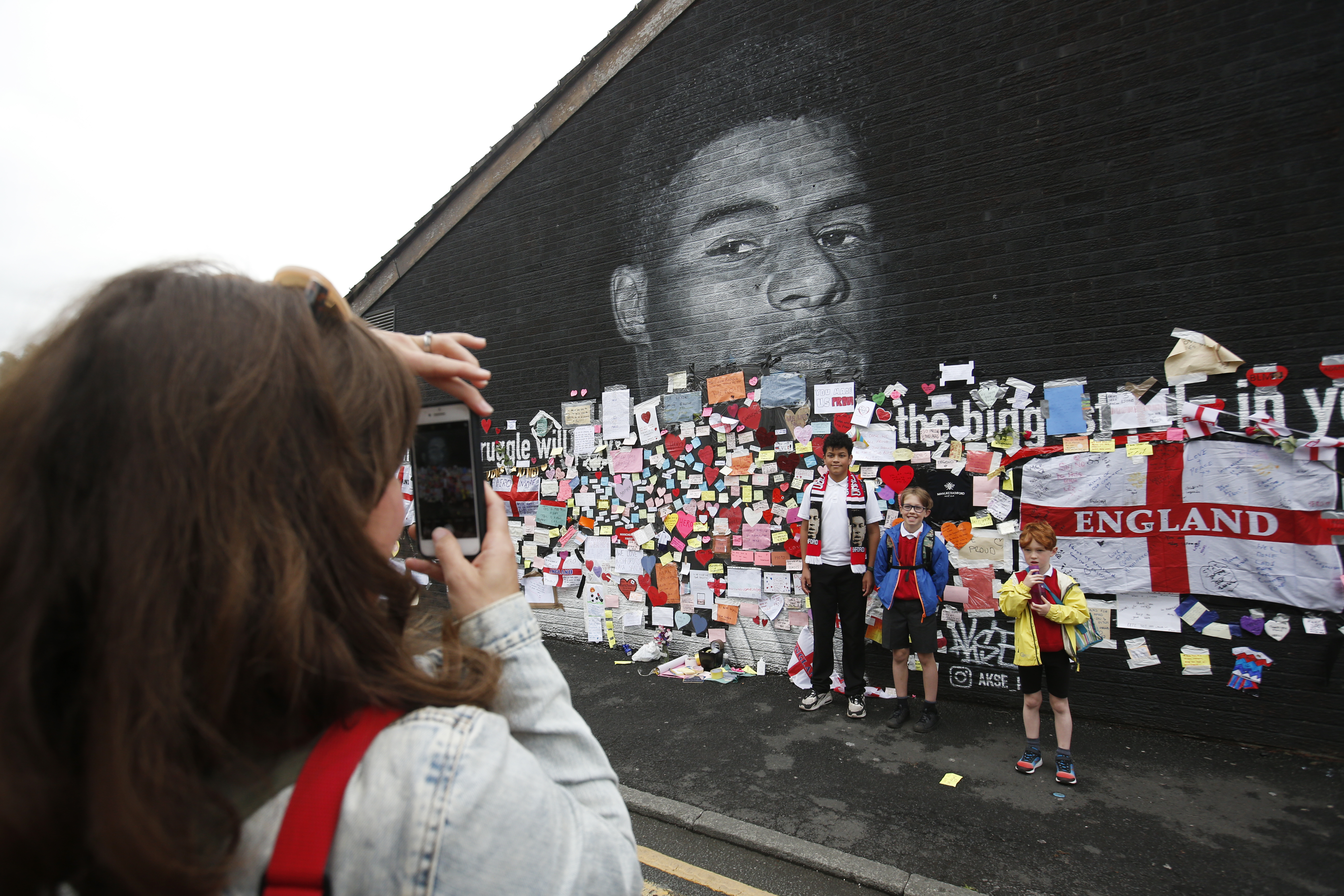 The Marcus Rashford mural was covered with messages of support after it was defaced following the Euro 2020 final between Italy and England. [Ed Sykes/Action Images via Reuters]