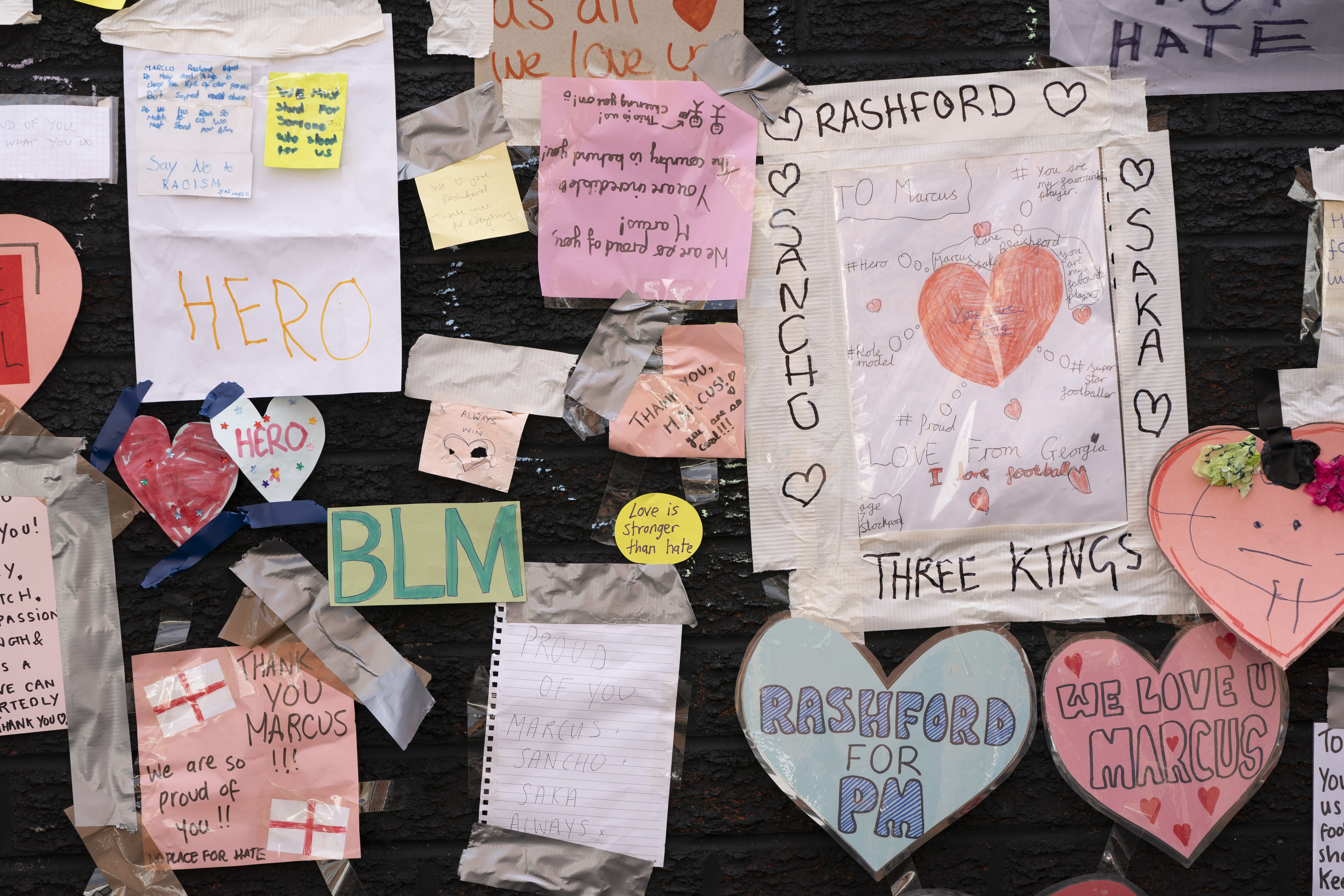 “We love you!” read one of the hundreds of small messages covering up the abuse on the mural to Rashford in the Withington area of Manchester. One pink heart was affixed on the mural with the simple word: “Hero.”