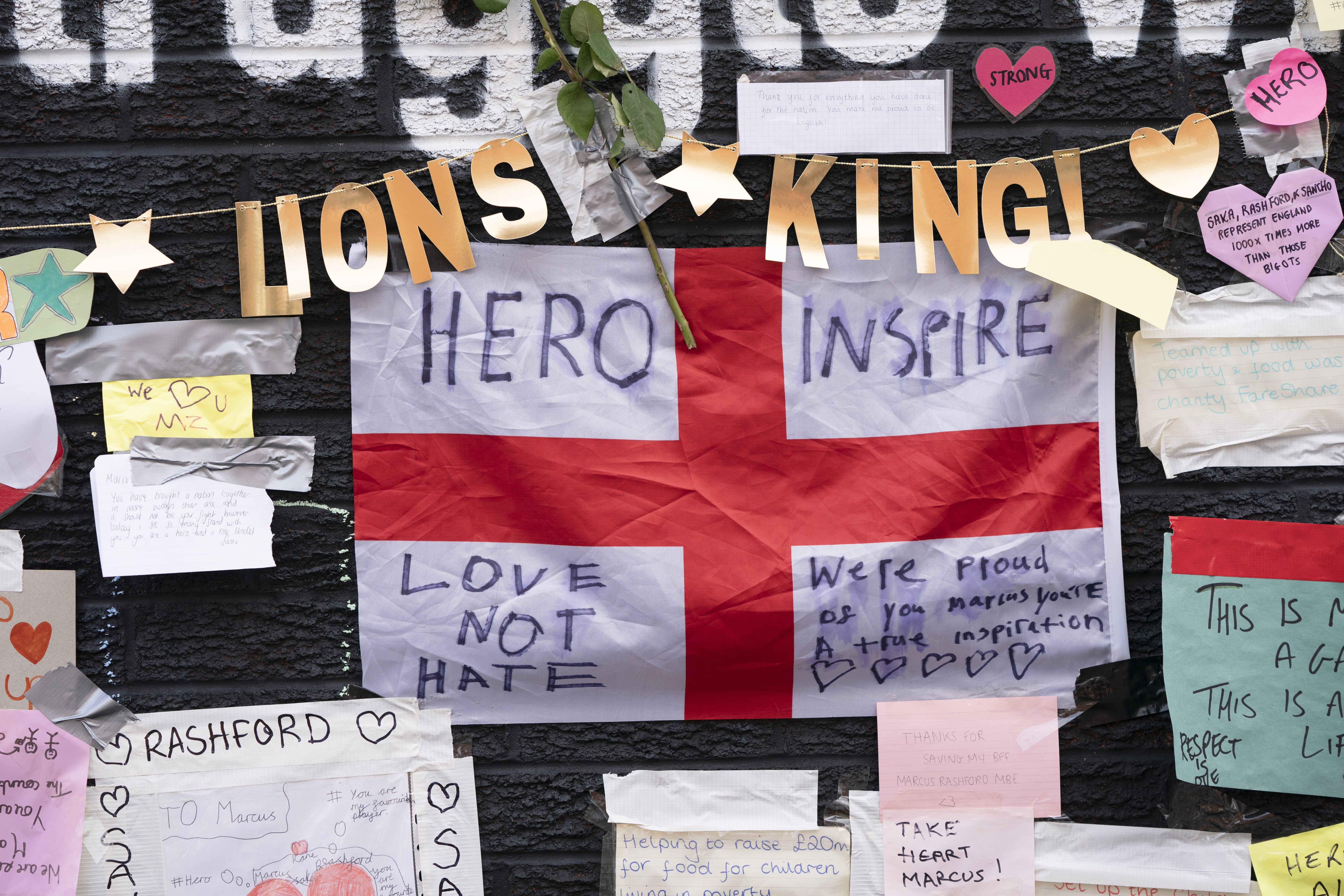 People in England have stepped up to defend footballer Marcus Rashford by covering the racist abuse scrawled on a mural to the Black player in his hometown with messages of love and support for a “hero” who they said was a national role model.