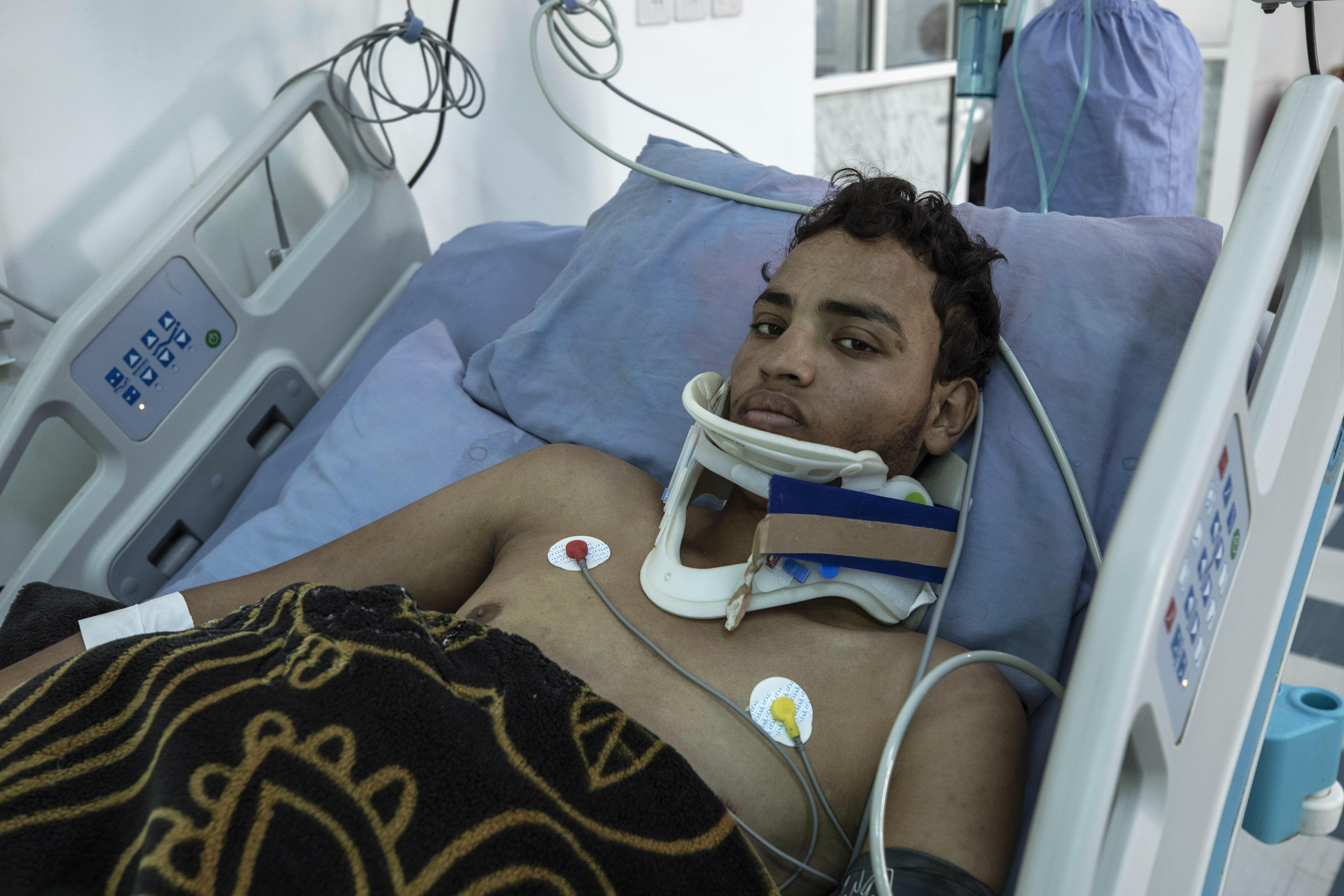 At an intensive care unit, there were 10 patients. In one of the beds, Ali Saad, 22, lay partially paralysed. He was shot by a Houthi sniper on the front line on June 18.